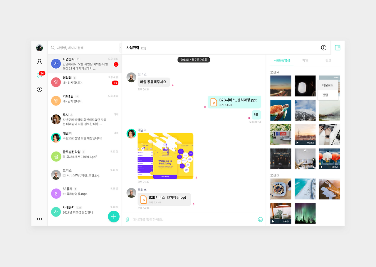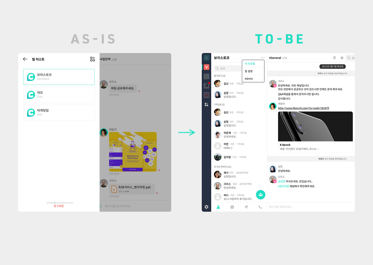 추가로 기존 왼쪽 사이드영역에 있던 메뉴영역을 리스트UI와 결합시켜 상단에 현재 이용중인 팀 스페이스의 이름을 노출시켜 바로 인지할수 있도록 개선하였습니다.