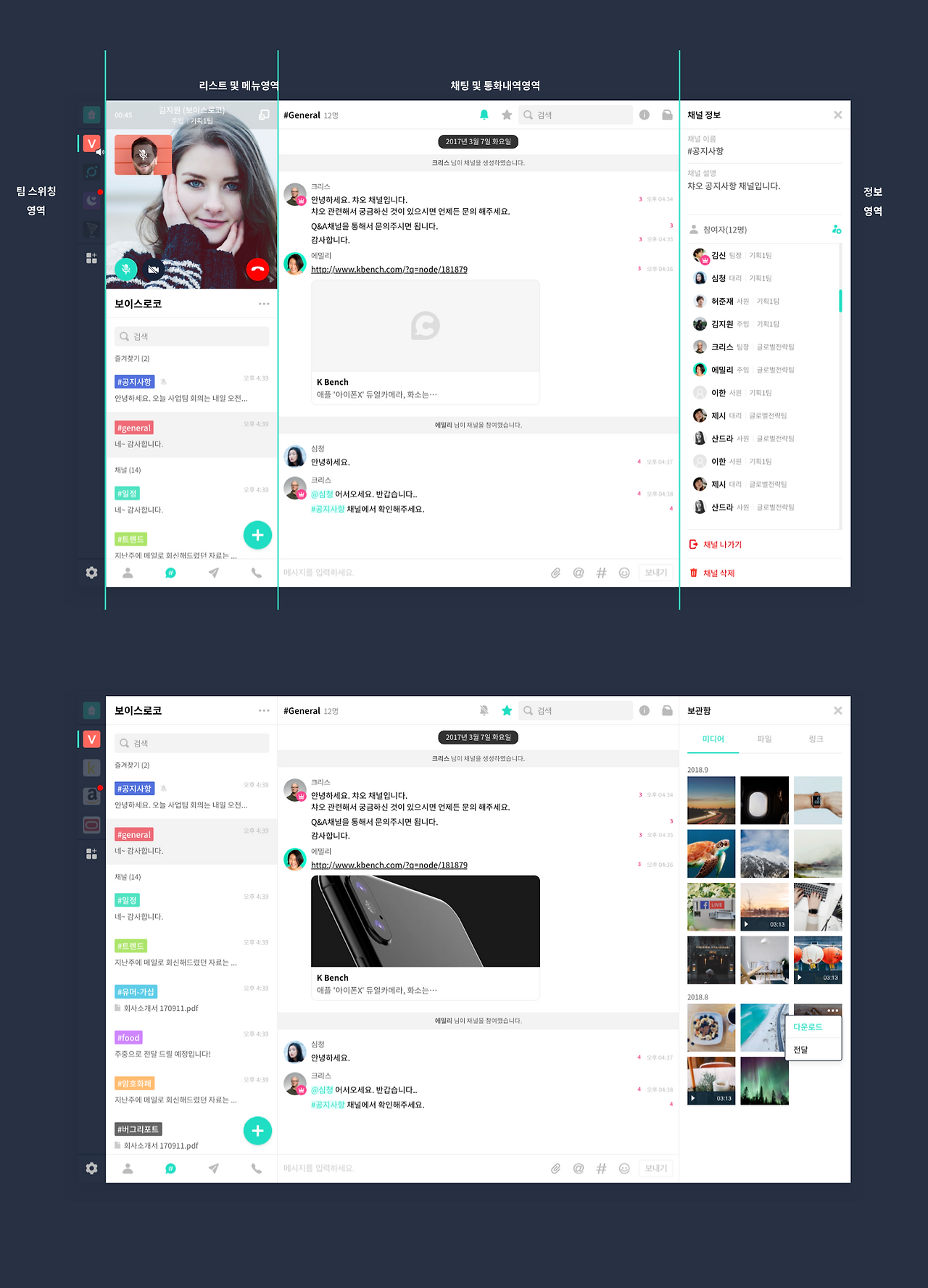 총 3가지의 중요 개선점을 바탕으로 챠오 웹폰의 새로운 레이아웃은 팀 스위칭 영역, 리스트 및 메뉴 영역, 채팅 및 통화내역 영역, 정보 영역까지 크게 4개의 영역으로 구분되어 각각의 목적성에 맞게 구성하여 사용성을 높이는데 초점을 두었습니다. 그와 함께 전체적인 톤앤매너와 디자인 스타일 가이드도 규정하면서 개선하였습니다.