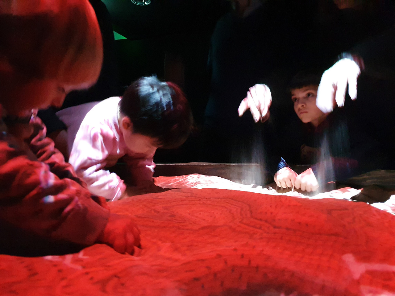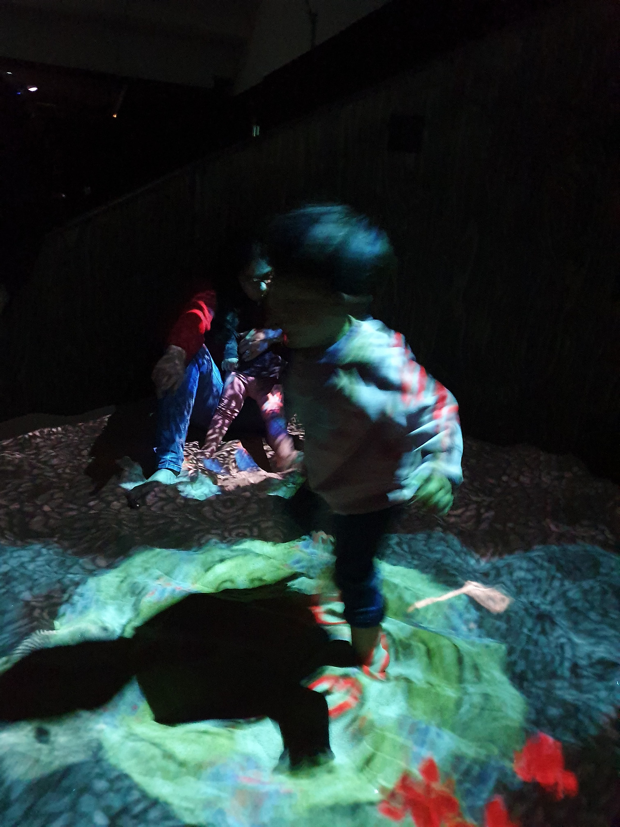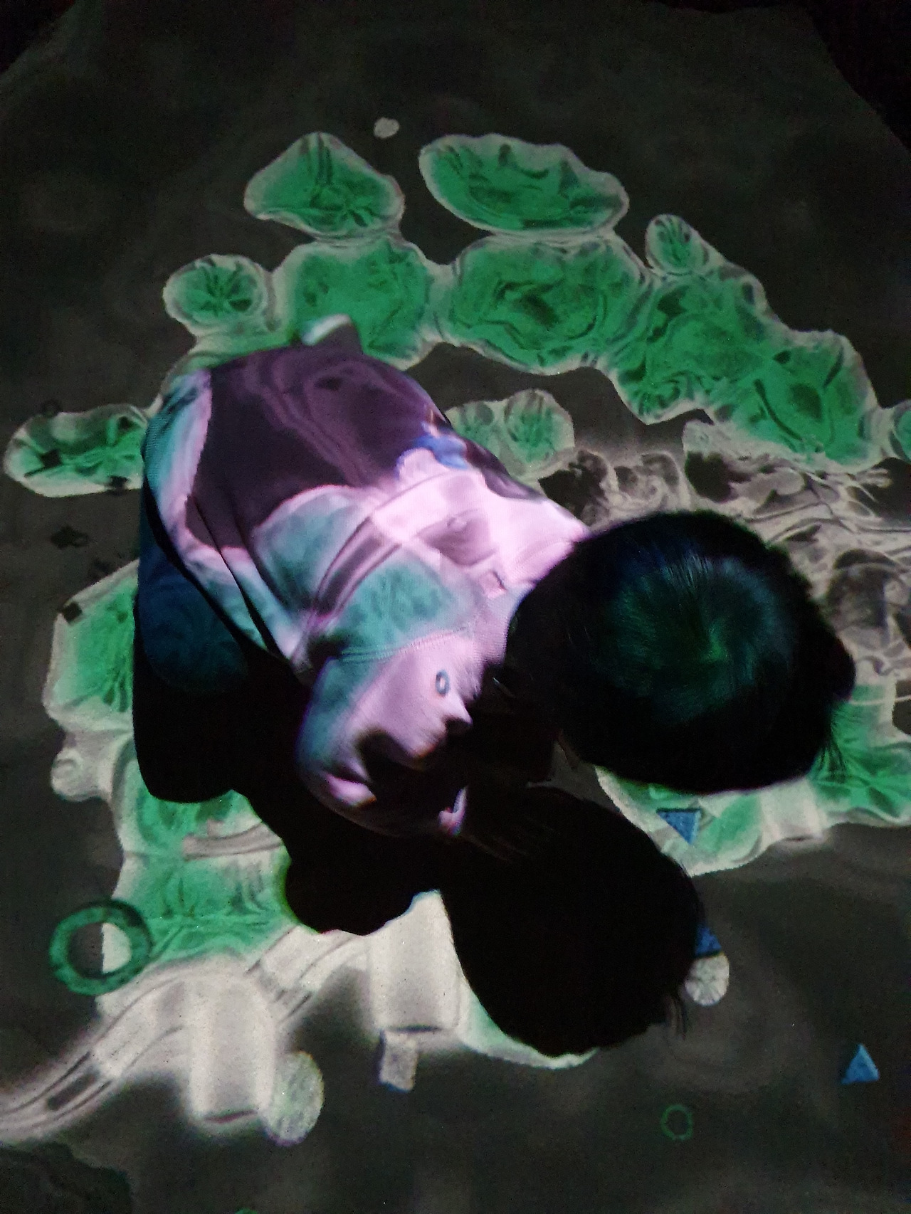 사운드 핏은 12월 행사 오픈 때 찾아와서 체험했던 프로그램이었는데 이번 어린이 축제 기간에도 진행을 하고 있었다. 아름다운 그래픽이 모래를 비추고 자신만의 동작으로 사운드 플레이해 나가는 체험 프로그램이다. 6가지 컨셉트의 모래 플레이존에서 손으로 느끼고, 그래픽의 변화로 몸의 움직임으로 소리를 만들어 내는 경험을 한다. 처음에는 촉감을 어색해하더니 어느새 흩어지는 그래픽에 소리에 신기한 듯 춤추며 즐겼던 곳이다.