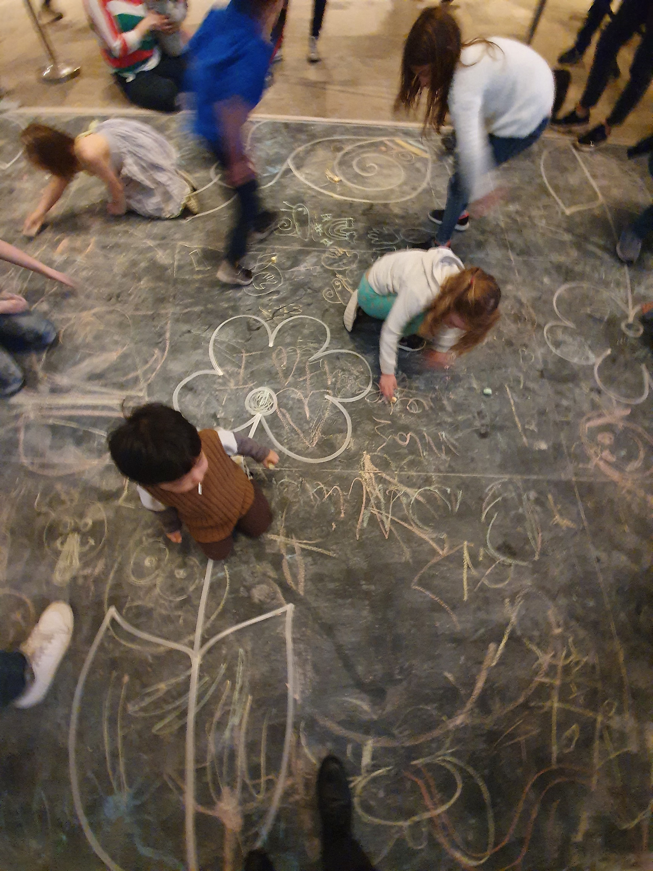 분필 가루가 풀풀 날리고 손과 옷이 하얗게 묻어나도 누구 하나 야단치는 부모가 없다. 대형 분필 보드 위에 드러누운 아이를 도와 그림을 도와주고 함께 놀이를 즐기는 부모밖에 없다. 아이에게 이렇게 해봐? 지시할 필요 없이 몇 분의 탐색 끝에 몸을 던져 드러누워 그림을 완성해 갔다.