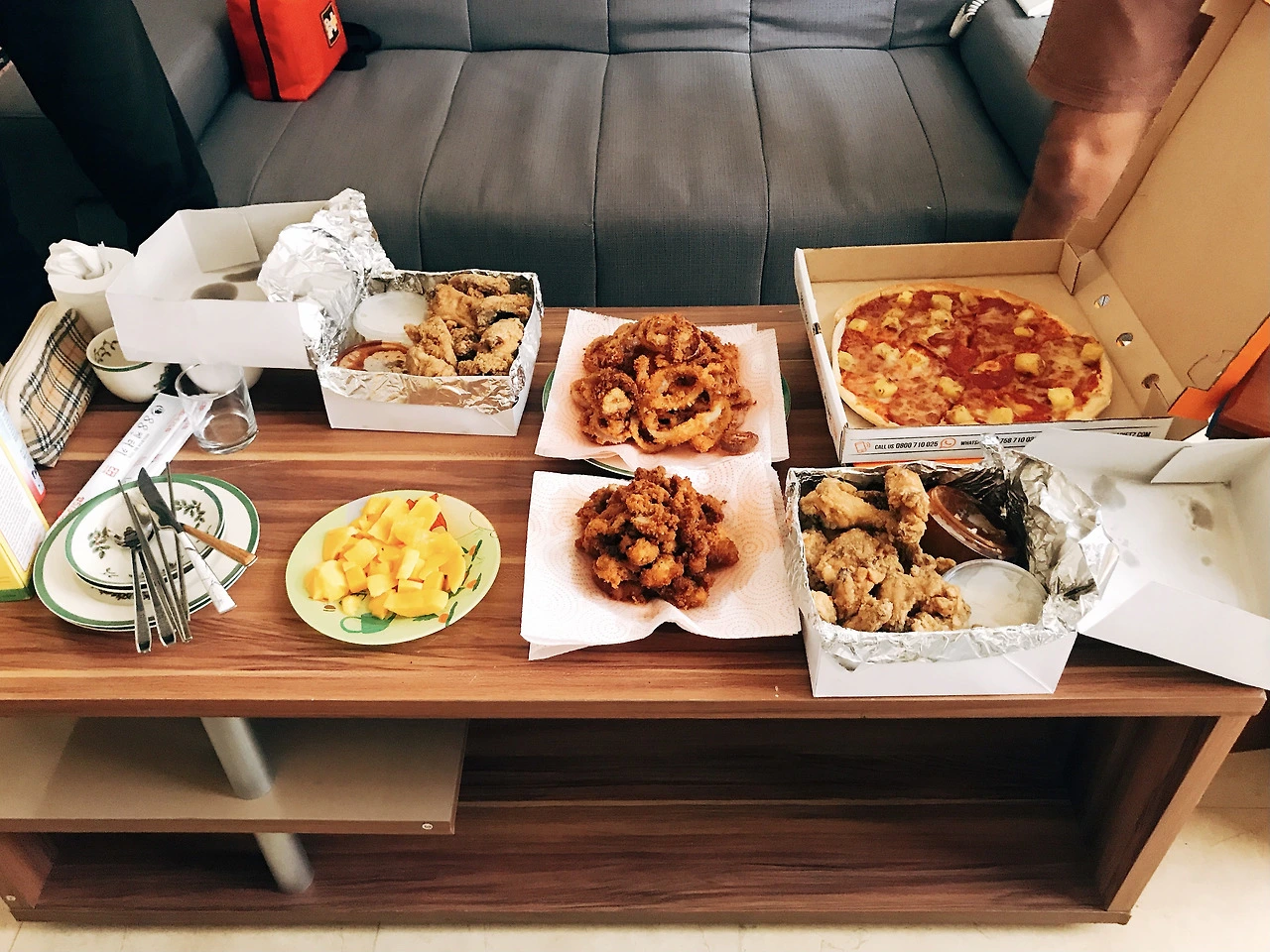 나는 장소와 피자를 준비했고, 동갑 친구 A는 집에서 어니언링과 닭튀김을 직접 해가지고 왔고, 동갑 친구 B는 는 망고를 준비했고, 형님 C는 한국식 치킨을 미리 예약해서 픽업해 오셨다. 소소하지만 같이 모여서 맛있는 음식을 먹고, 수다도 떨고, 게임도 같이 하니 이때만큼은 가장 짜릿하고 즐거웠던 하루였다.