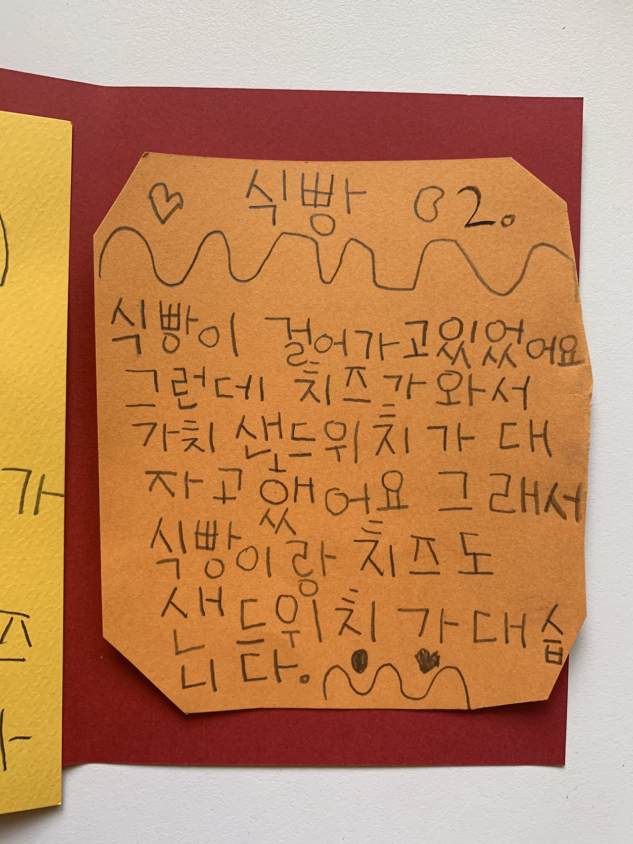 식빵이 걸어가고 있었어요. 그런데 치즈가 와서 같이 샌드위치가 되자고 했어요. 그래서 식빵이랑 치즈는 샌드위치가 되었습니다.