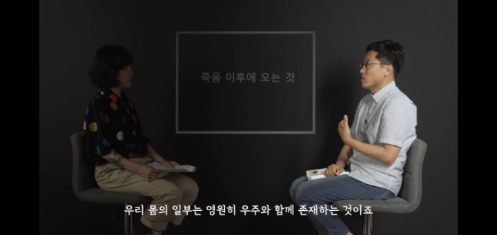 “죽음 이후에도 여전히 영속하는 것이 있을 수 있어요. 바로 우리 인간의 몸을 이루고 있는 수많은 원자들, 이런 것들이 물론 죽은 다음에는 이 형태로 있지는 못 하지만 원자 그 자체는 영속하거든요. 원자는 우주의 시작부터 지금까지 존재했고요. 앞으로도 우주가 사라지지 않는 한 존재할 겁니다. 여기에는 수많은 물리학의 보존 법칙이 그 영속을 보장해 주고 있어요. 어떤 의미에서 우리는 원자의 형태로서는 영속할 수 있는 거고요. 영원할 수 있는 거고. 실제로 우린 죽더라도 인간의 형태가 아니라서 안타까울 수 있지만 원자가 되어 뿔뿔이 흩어져서 내가 정말로 좋아하던 어떤 나무가 될 수도 있고요. 아니면 내가 좋아하는 책의 일부가 될 수도 있고 어떤 원자들은 지구를 떠나서 다른 별로 가서 하늘에 보이는 하나의 별의 일부가 될 수도 있습니다. 그렇게 본다면 우주가 존재하는 한 우리 몸의 일부는 영원히 우주와 함께 존재하는 것이지요.”