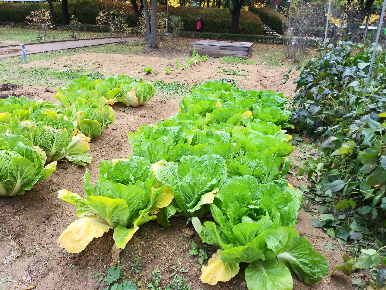 다른 한쪽에서는 배추가 갑자기 보였어요. 공원에는 구민들이 작게 주말 농장 하는 자리도 있는데요. 이렇게 배추가 자라고 있을 줄은 그동안 몰랐습니다. 이제는 뽑을 때가 되어 보입니다. 어서 김치로 만들어줘야 할 만큼 배추가 잘 자랐습니다. 아닌 게 아니라 지난 주말에는 저도 김장을 하고 왔거든요. 햇살 좋은 날 시골 마당에서 자리를 척하니 펼쳐놓고 동네분들과 함께 품앗이 김장을 했습니다. 마을 사람들이 모여하니 후딱 이었습니다. 김장하는 날에 빠지면 섭섭한 보쌈도 맛있게 먹고 왔습니다. 김장을 마치고 나니 팔뚝은 좀 아프지만 마음이 참 한가 해지네요. 지금은 베란다에 놓여 있는 김장 김치들은 내일쯤 김치냉장고에 넣을 예정입니다. 냉장고에 꽉꽉 채워져 있을 김치통을 보면 이 겨울 든든해지겠죠.