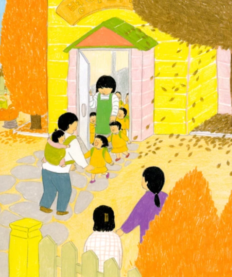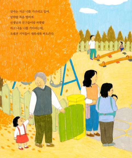 아이라는 존재를 표시하기 위한 색깔로 언제부터 노란색이 그 시그니처 색이 되었을까. 삐약삐약 병아리 색이라 그런 걸까? 환하게 가장 눈에 잘 띄는 색깔이어서 그런 걸까? 아이가 타는 어린이집 차량부터 학원 셔틀버스 그리고 학교 근처 건널목에 있는 옐로카펫까지 죄다 노랑으로 점철된다. 이 그림책의 표지를 아우르고 있는 노란색은 아이의 어린 시절과 그 시절 함께 어렸었던 엄마를 떠올리게 한다.