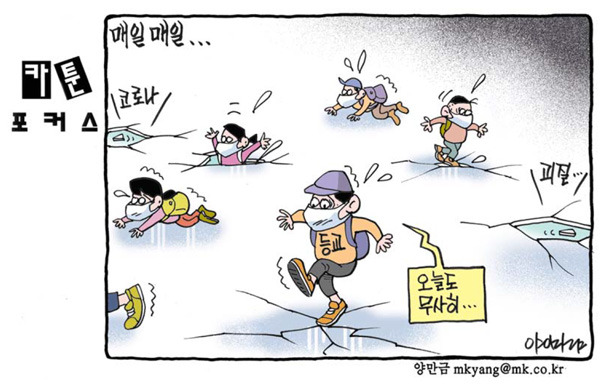 오늘 오전의 이 난리가 이 카툰에서 오롯이 전해진다. 오늘도 무사히. 요즘 마음이 살얼음판을 걷는 딱 그 심정이다.