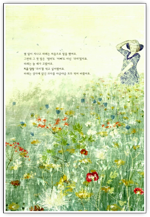 주변 사람은 할머니를 치매 환자로서 대하지만 마레는 그렇지 않았다. 텅 빈 병실 벽에 그림을 그리고 과자 담는 접시도 빼놓지 않는다. 마레는 정확히 알고 있던 것이다. 할머니가 원하는 것이 무엇인지를. 마레 나름의 노력은 효과가 있었다. 그림책 화면은 다시 환하게 되고 누워있는 할머니의 표정에도 미소가 지어진다. 모두가 알아듣지 못하는 할머니 말에 마레만이 알아들을 수 있었다.