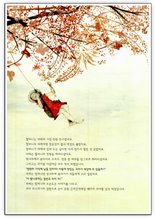 그 곁에 마레는 혼자가 아니다. 꽃밭에서도 나무 그네에서도 늘 마레 옆에 할머니가 계시다. 마레에게 가장 좋은 친구는 할머니였다. 보호자로서의 할머니가 아닌 정말 딱 나랑 재미나게 일상을 함께 하는 친구로 말이다.
