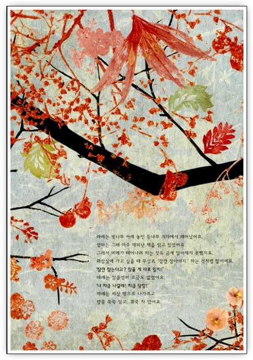 아주 그림이 예쁜 책을 만났다. 마치 동화 속 한가운데로 내가 들어온 듯 그림책 전반에 깔려있는 다홍색이 참으로 매혹적이다. 이 책은 치매와 죽음을 다루고 있다. 그러나 그런 심각한 소재보다 마레가 보여주는 공감 능력에 난 더 주목하고 싶다.
