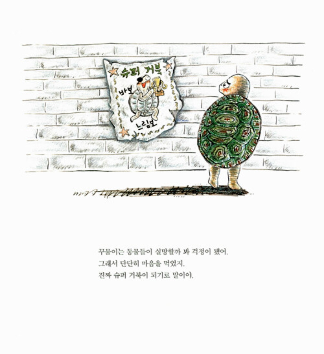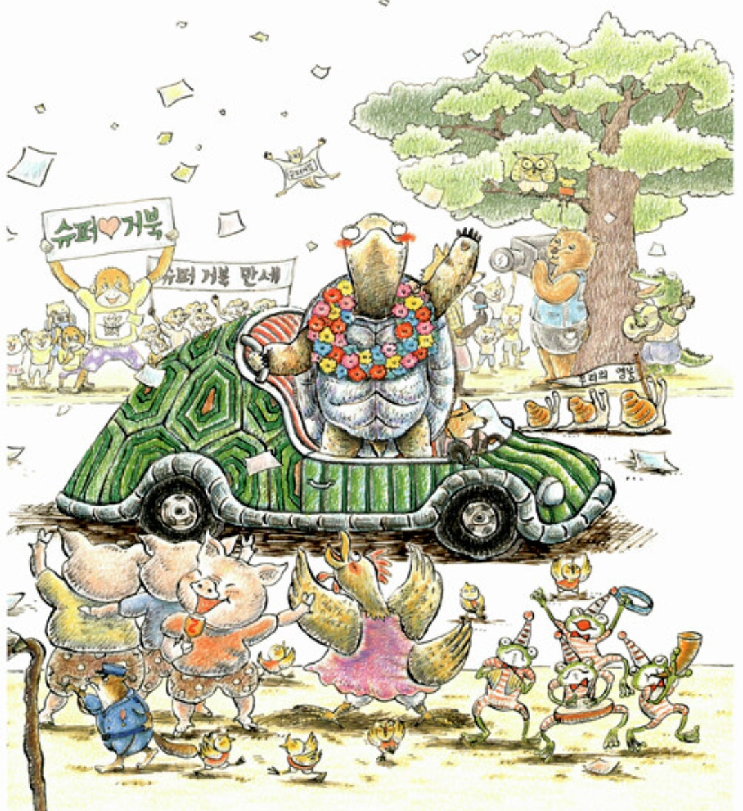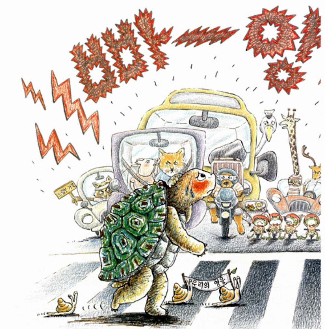 그렇다면 거북이의 일상은 어떻게 변했을까? 놀림받은 게 속상해 토끼에게 도전장을 내밀었던 거북이다. 그리고 보란 듯이 이겼다. 자신만만하고 뿌듯한 삶을 앞으로 살게 될 거라는 게 불 보듯 뻔하다. 그러나 한번 솔직히 따져 보자. 거북이가 토끼를 이겼다 해서 거북이가 토끼보다 느리다는 것, 아니 달팽이 빼고 어지간한 다른 동물들과 견주어도 거북이는 빠른 동물이 아니라는 게 사실 아닌가. 토끼의 방심이라는 기회를 발판 삼아 승리했지만 그렇다고 거북이 본성이 달라진 것은 아니지 않은가.