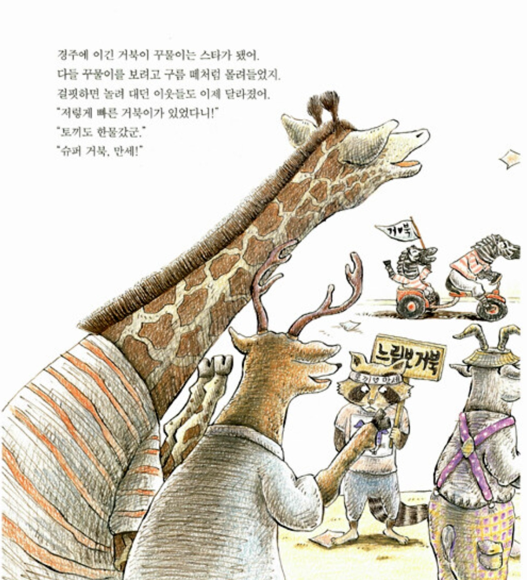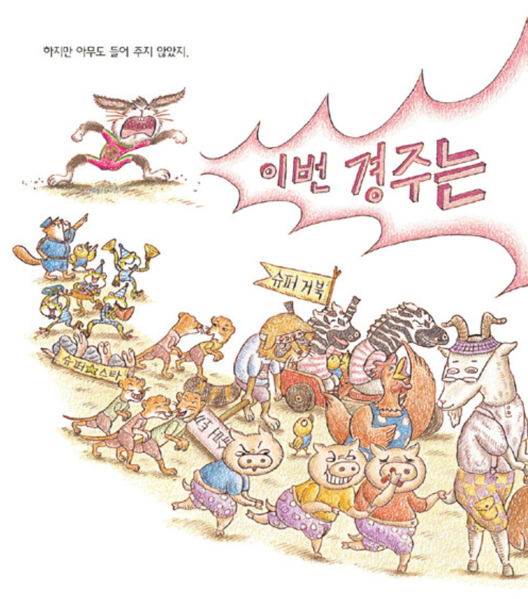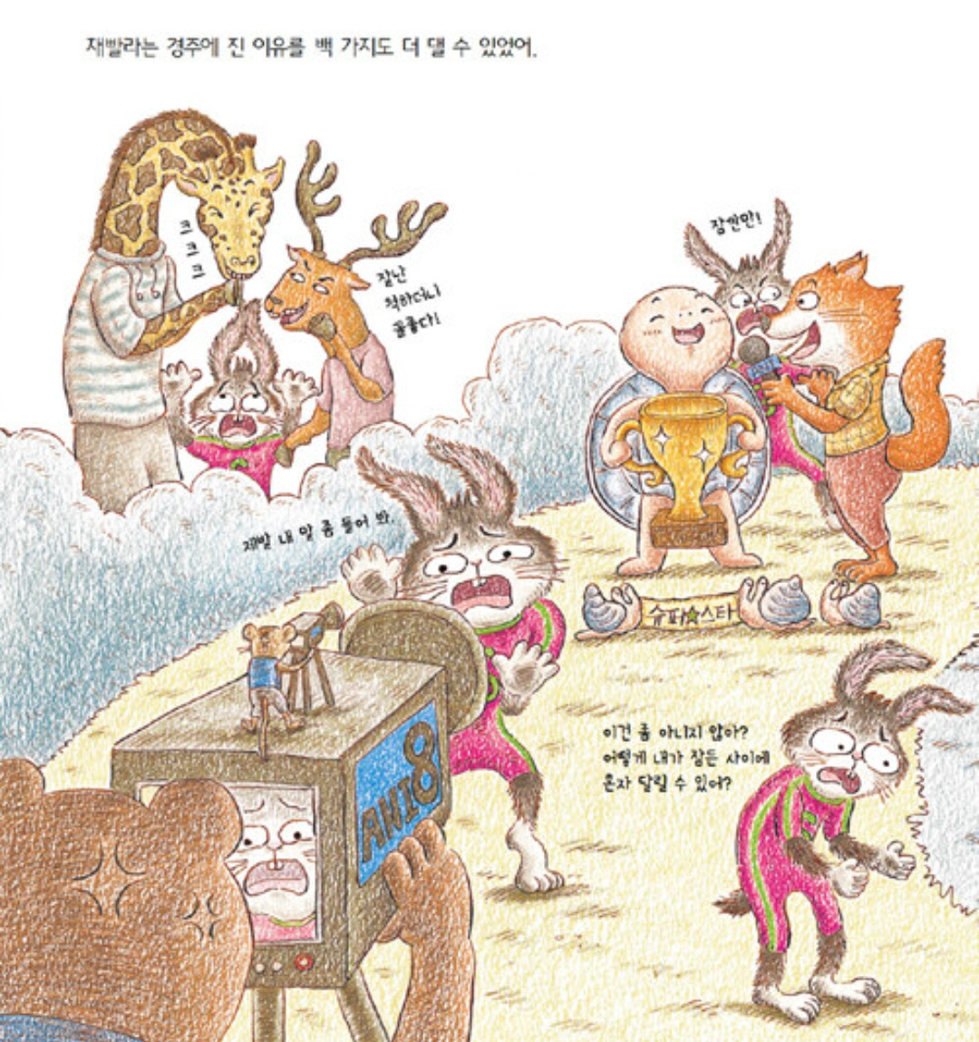 옛이야기를 유쾌하게 재구성하고, 형만 한 아우 없다는 말을 비웃기라도 하듯 후작도 멋들어지게 만들어낸 유설화 작가에게 박수를 보낸다. 이 그림책은 그림을 하나하나 자세히 봐야 한다. 그림책 곳곳에 작가의 다른 그림책 깨알 홍보가 엿보인다. 대놓고 홍보하는 TV 드라마 PPL을 보는 것만큼이나 웃기면서도 귀여운 장치이다. 여러 동물 캐릭터가 두 권의 그림책에 걸쳐 각자의 목소리가 실제로 들리는 듯 느껴질 정도이다. 그중 끝까지 토끼를 응원하는 너구리가 내겐 단연 눈에 띄었다. 너구리는 거북이에게 진 토끼에게 실망은 했지만 그렇다 해서 거북이를 남들처럼 따라 하지는 않는다. 다만 구석에서 '느림보 거북' 팻말을 끝까지 들며 속상한 표정을 지을 뿐이다. 비록 너구리 자신이 출전한 달리기 대회에서는 '슈퍼 너구리'라는 머리띠를 두르고 뛰긴 하지만 결코 토끼를 배신하지는 않는다. 그런 단 하나의 팬의 존재로 어쩌면 토끼는 다시 일어설 수 있었을지 모른다. 토끼는 진정한 팬심을 보여준 너구리에게 진심 고마워해야 한다!