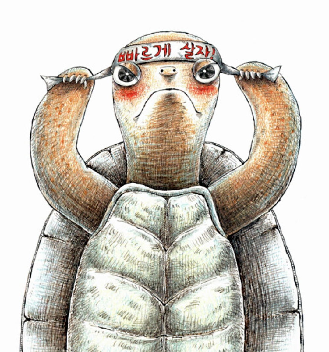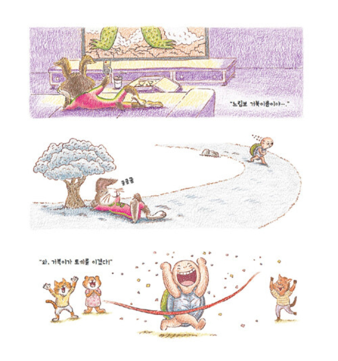 본질은 속도가 아니었다. 게임은 게임일 뿐인데 대중은 핵심을 놓쳤다. 포기하지 않고, 한눈팔지 않고 달렸던 거북이의 근성을 높이 사야 했다. 그가 토끼를 이길 수 있었던 것이 속도 때문이 아니지 않은가. 자만하여 생애 첫 좌절을 맛봤을 토끼에게도 그렇게나 모두가 뺑 등을 돌려서도 안됐다. 변명일지라도 하소연하는 그의 말을 들어줬어야 했다. "뭐 살다 보면 그런 일도 있을 수 있지"하며 가볍게 어깨라도 톡톡 누군가 한 사람이라도 다독여줬어야 했다. 그랬다면 적어도 재빨라가 그렇게까지 자포자기하며 배불뚝이 토끼는 되지 않았을지도 모른다.
