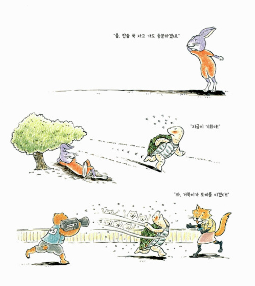 자고 있는 토끼를 보고도 깨우지 않고 그냥 지나간 거북이를 공정하지 않다고 평가하는 세간의 목소리가 있긴 하다. 그러나 승부를 가르는 경기이지 않았는가. 토끼가 열심히 경주하다가 교통사고를 당했다는 그런 불가피한 상황도 아니었다. 그저 상대를 얕보고 방심한 토끼를 깨울 의무가 거북이에게 과연 있을까. '토끼와 거북이'는 꾸준히 노력하는 자가 결국 승리한다는 교훈을 남기기에 손색없는 우화인 것이다.