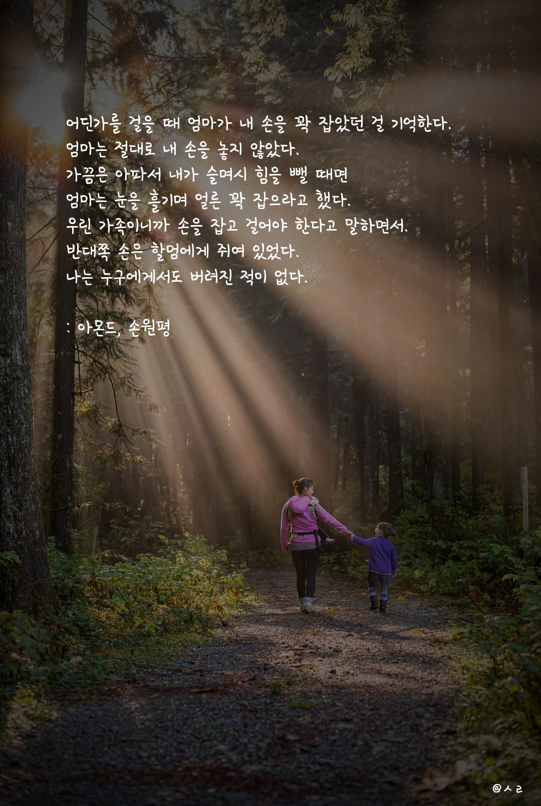 어딘가를 걸을 때 엄마가 내 손을 꽉 잡았던 걸 기억한다.