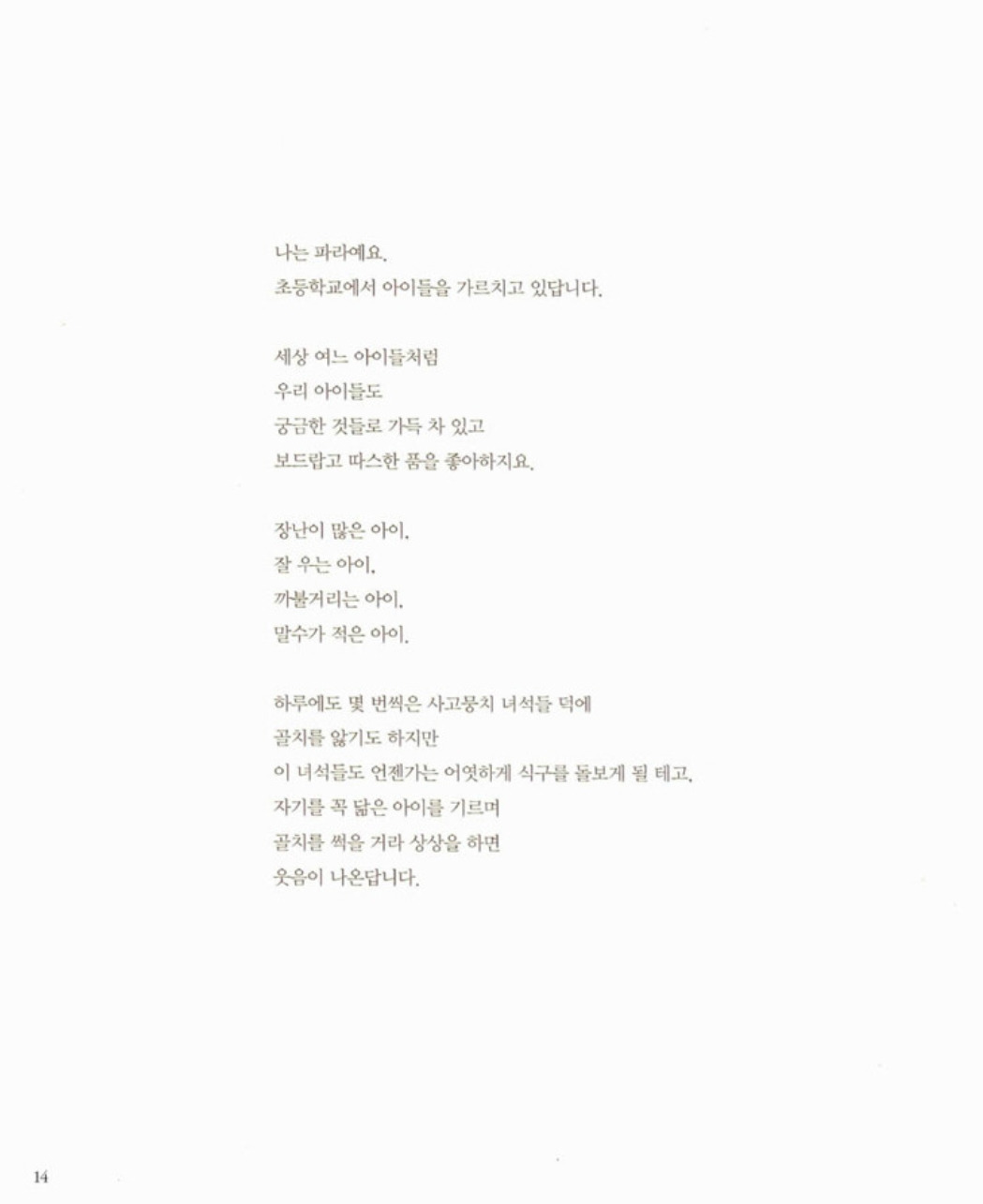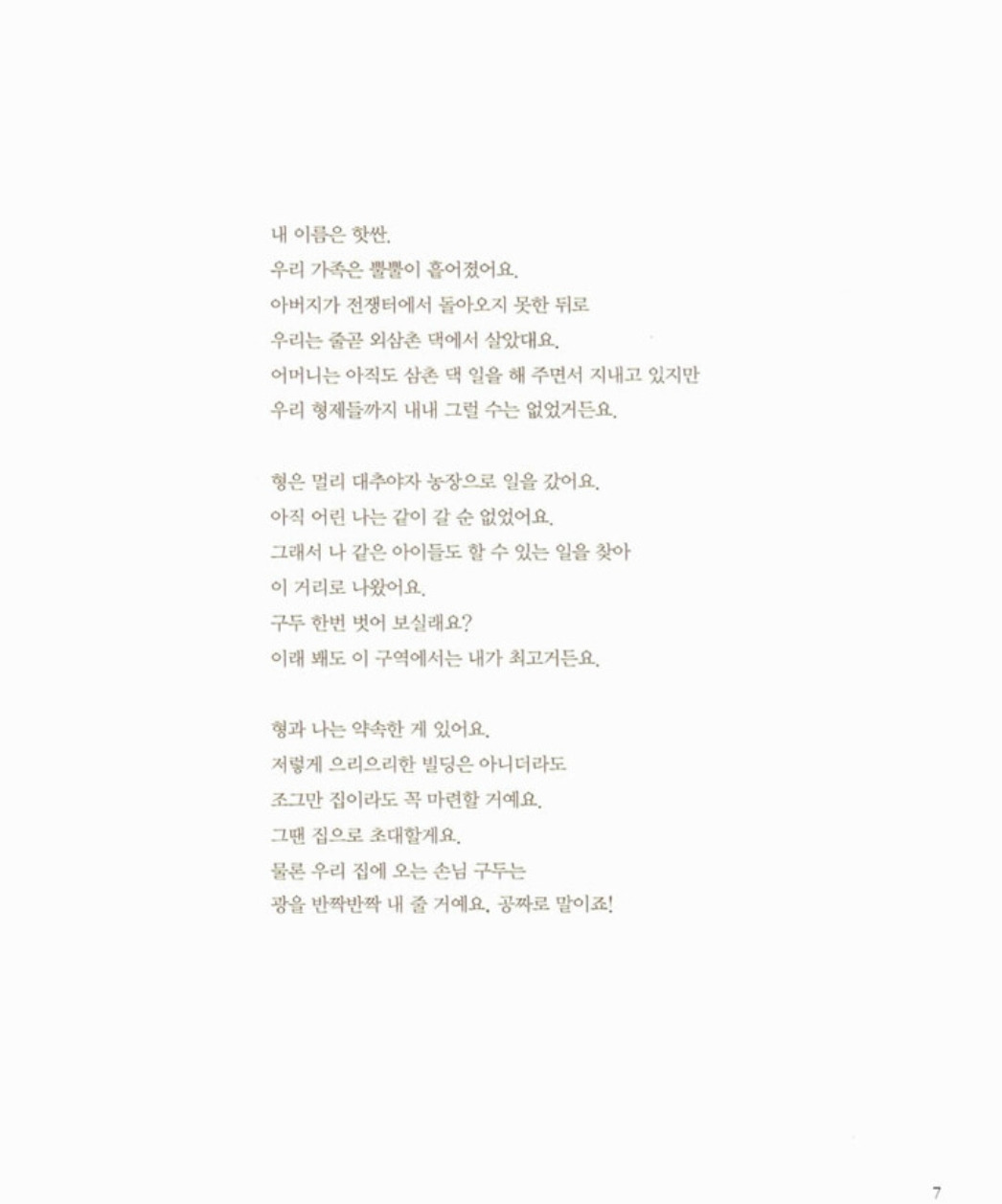 착한 전쟁이란 것이 진정 존재할 수 있을까? 복잡하게 얽히고설킨 이 세상 일에 여전히 무지하지만 다시는 그런 일이 일어나지 않길 바랄 뿐이다. 김중미 작가처럼 아이들과 함께 광화문에서 피켓을 들고 있지는 못했지만 그림책을 꺼내 우리 아이와는 같이 읽고 얘기할 수는 있을 것 같다. 마을 아이들을 보살피는 살람 아저씨와 조그만 자기 집을 갖고 싶었던 구두닦이 핫싼, 그리고 그곳의 친구들에게 사랑을 전한 박기범 작가의 마음도 아이와 함께 느끼고 싶다. 나중에 아이가 세상의 영웅이 되지 않아도 좋다. 적어도 남의 꿈을 저버리는 사람이 아니길 바란다. 길을 잃어 울고 있는 누군가에게 가끔은 엄마나 언니가 되어주는 그런 따뜻한 사람으로 자라준다면 더 이상 바랄 게 없겠다.