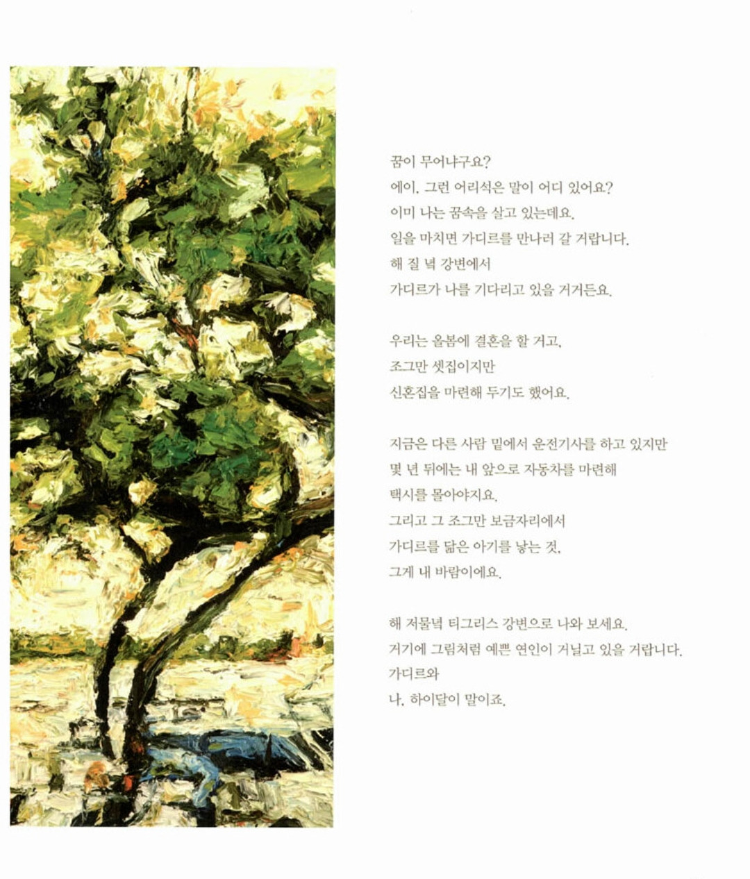 해 저물녘 티그리스 강변으로 나와 보세요. 거기에 그림처럼 예쁜 연인이 거닐고 있을 거랍니다. 나는 파라예요. 초등학교에서 아이들을 가르치고 있답니다.