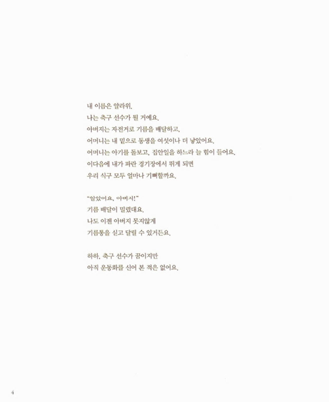내 이름은 알라위. 나는 축구 선수가 될 거예요. 내 이름은 핫싼. 우리 가족은 뿔뿔이 흩어졌어요.