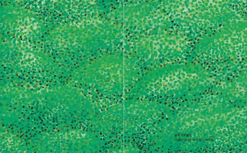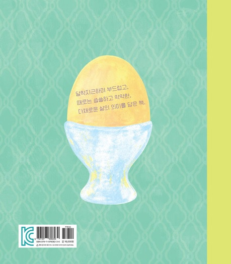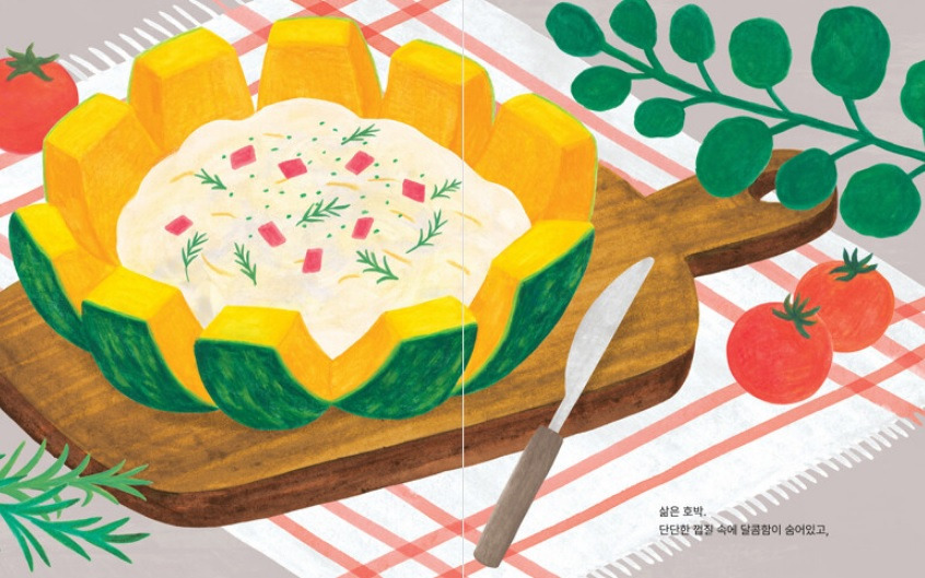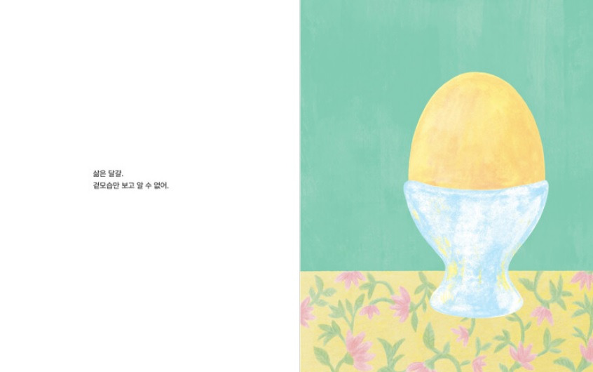 어떤 블로거는 부엌에 놓으면 좋은 그림책이라고 이 책을 소개했다. 가정용 정수기 옆에 살포시 그림책을 올려놓은 사진이 꽤나 어울렸다. 물을 먹으러 왔다가 민트색 그림책 표지 그리고 뭉게뭉게 쓰여있는 아리송한 제목을 보고 아이는 아마도 호기심에 책을 들여다보게 될지도 모른다. 마침 그날따라 저녁 메뉴가 삶아진 달걀과 감자와 호박이라도 있다면 정말 제대로 된 설정이 아닐까.