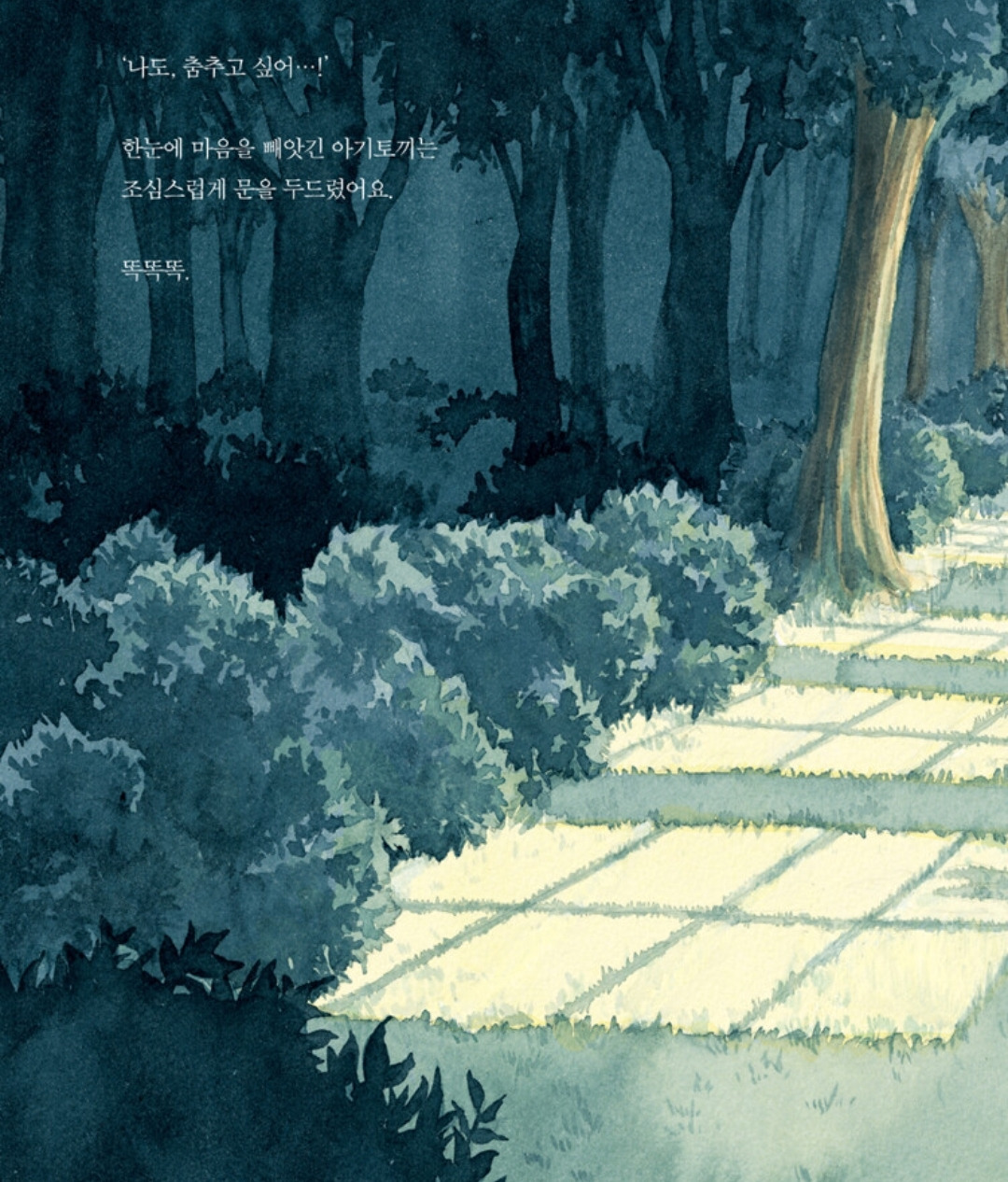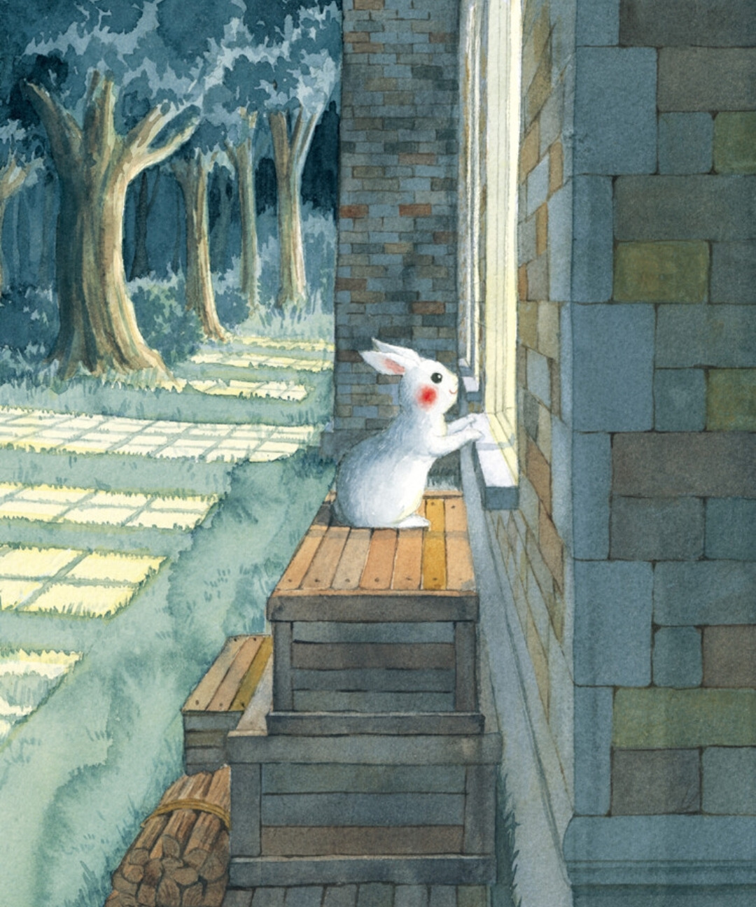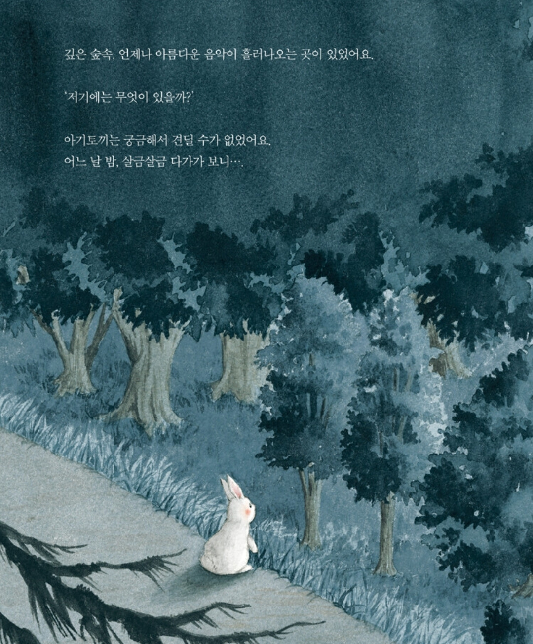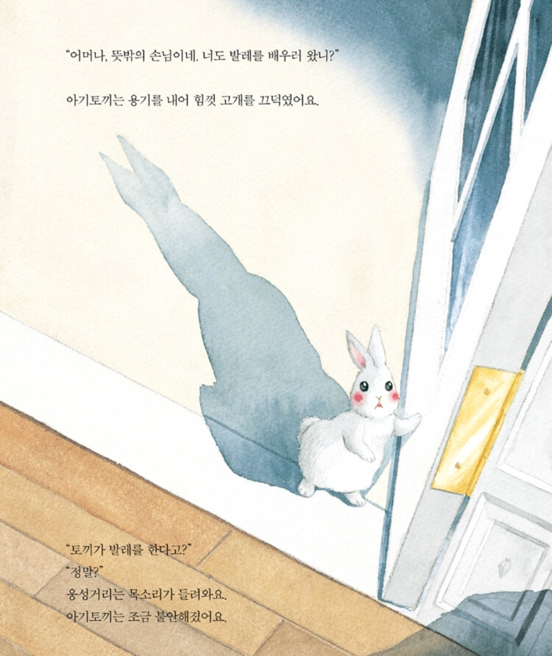 한눈에 마음을 빼앗긴 아기토끼는 조심스럽게 문을 두드렸어요.