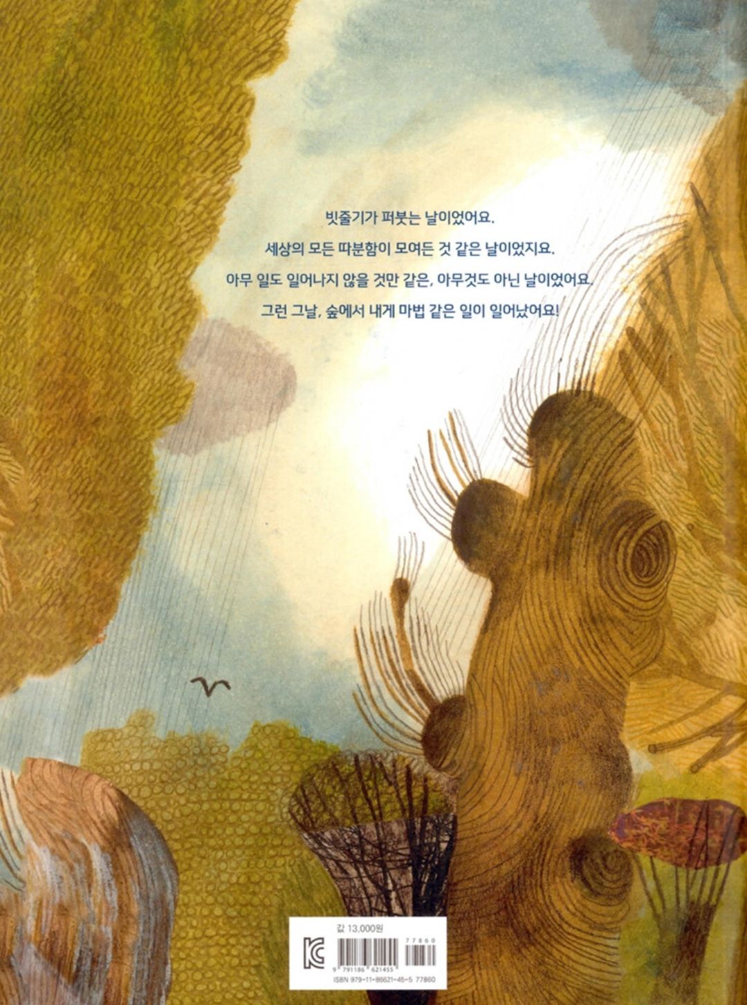 그림책 『쏘피가 화나면, 정말 정말 화나면』의 쏘피는 커다란 밤나무에 올라가 거대한 자연과 마주하고 기분이 풀어져 가족이 있는 집으로 다시 돌아온다. 이 책은 얼마나 자연이 위로가 되는지, 언제나 그렇듯 자연이 옳음을 다시 깨닫게 했다. 그림책 『숲에서 보낸 마법 같은 하루』에서의 아이도 쏘피처럼 나무에 오른다. ‘왜 전에는 해 보지 않았을까’하고 의문이 들 정도로 아이는 자연이라는 신기한 세상에 푹 빠지며 마음이 한결 편안해짐을 경험한다.
