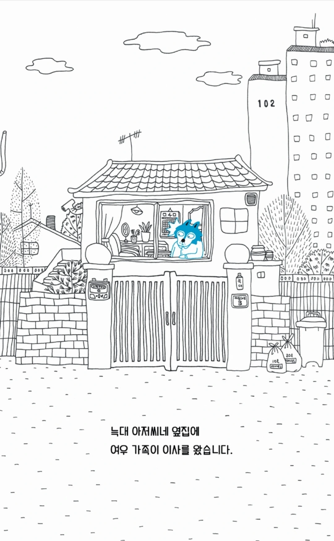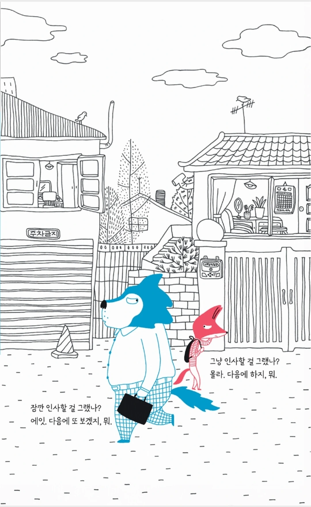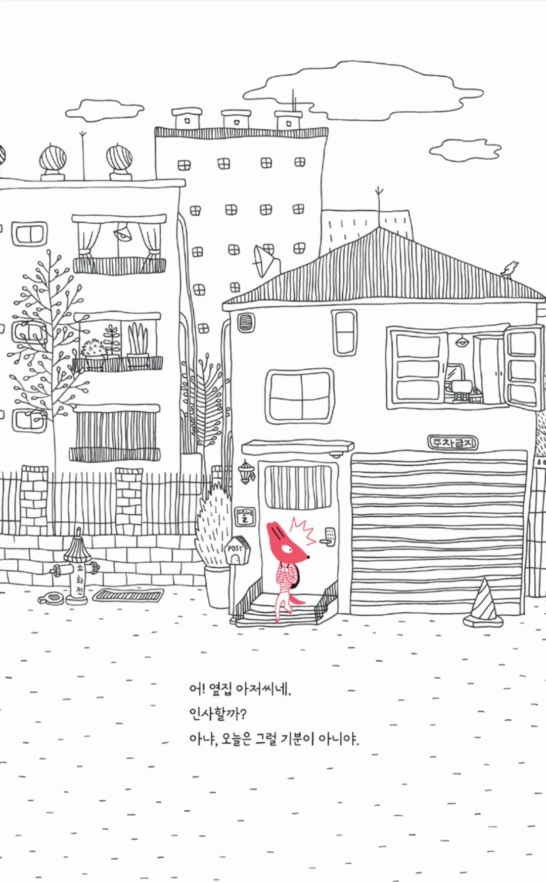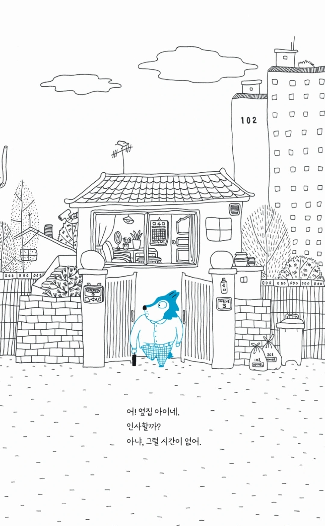 그림책 『인사』는 우리도 종종 아파트 복도나 엘리베이터에서 마주하는 난감한 순간 그 타이밍에 대해 여실히 보여주고 있다. 그러니까 다음으로 미뤄서는 안 된다. 망설여지는 때, 바로 그때가 가장 적기이지 않을까. 최근에 나도 이 그림책 속 여우 아이와 늑대 아저씨처럼 고민만 하다 타이밍을 놓쳤던 일이 있었다.