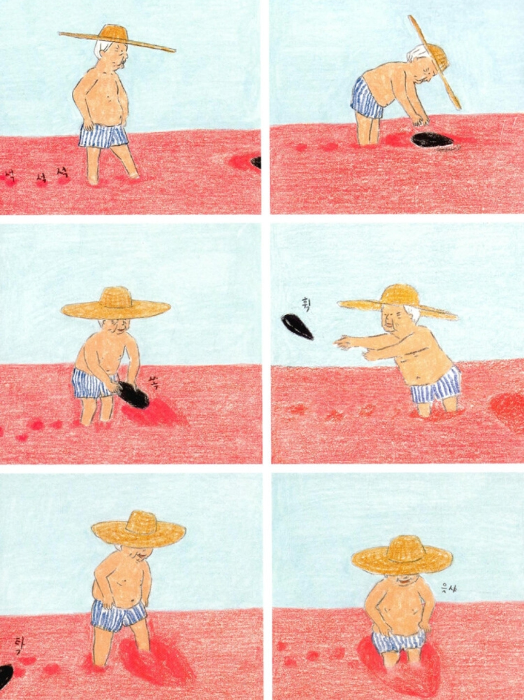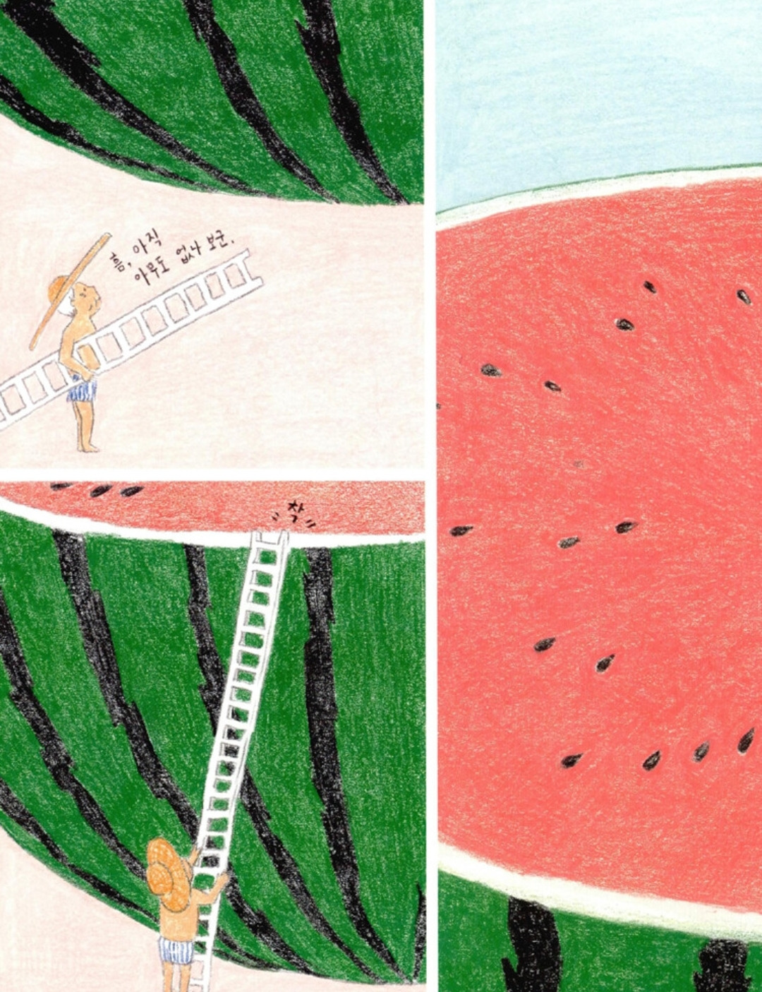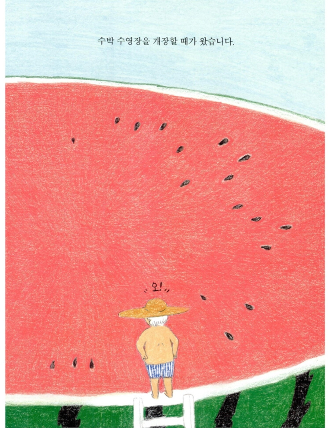 그래도 그림책 속 아이들이 수박 수영장 속으로 퐁당 빠지는 그림을 보노라면 우리 아이들의 그만한 시절이 떠올랐다. 아이들은 저학년 때 일 년 정도 수영을 배웠다. 끝내주게 잘하는 수영 실력은 아니지만 무서워하지 않고 어디에서도 물놀이 정도는 거뜬히 할 수 있을 정도는 되었다. 그거면 족했다. 아이들한테 가르친 것 중에 만족도가 높았던 나름의 사교육 중 하나다. 물놀이에 익숙하지 않아 그런지 나는 물이 무섭다. 어릴 적 소독약 냄새 물씬 나는 수영장에서 코로 입으로 그 물을 흠씬 마시고 허우적거리던 공포의 순간이 아직도 잊히지 않는다. 발이 닿지 않는 바다에 몸을 담근다는 건 엄두도 나지 않는다. 그에 비해 자유롭게 바닷속으로 뛰어들 수 있는 아이들은 나의 대리만족이 되기도 했다.