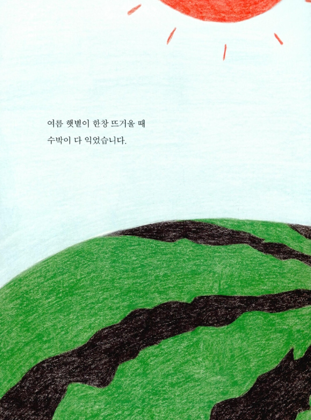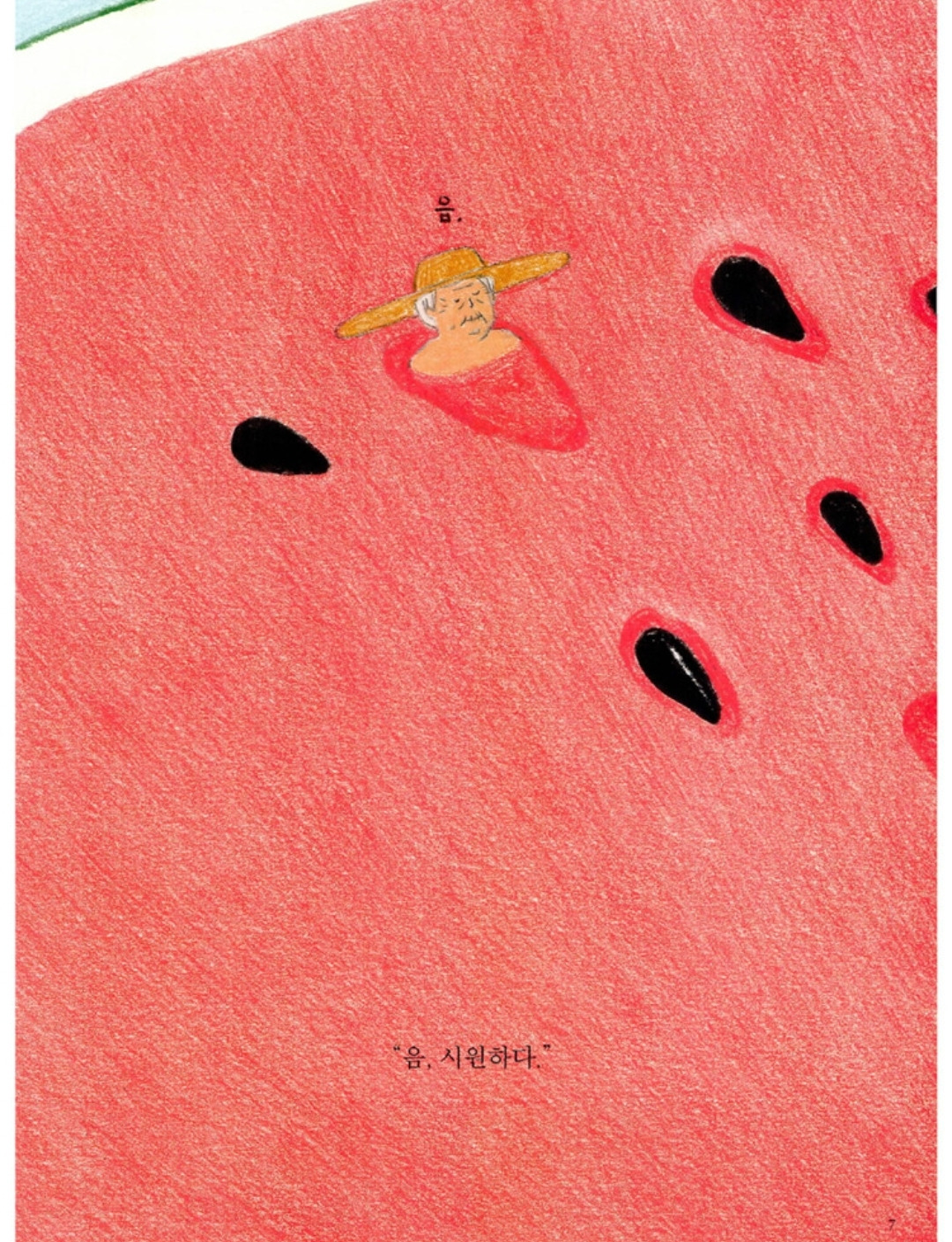 그림책 <수박 수영장>은 색연필 톤이 친근하고 편안해서 좋다. 애니메이션 <겨울왕국>에서 눈사람 울라프에게 녹지 말라고 엘사가 만들어준 눈구름처럼 수박 수영장에서는 뜨거운 햇볕을 가려줄 구름 양산과 먹구름 샤워가 있다. 아이를 생각하는 엄마의 마음처럼 배려와 재치가 있는 장치다. 엄마가 부를 때까지 수박 수영장에서 신나게 놀던 아이들이 해가 지는 것을 지그시 바라보는 장면은 서서히 주황빛으로 물들어가던 바닷가를 우리 아이들이 잔잔히 걷던 뒷모습이 떠오르기도 해서 인상적이었다. 물만 보면 와다다다 뒤도 안 돌아보고 뛰어가던 아이들의 유년 시절은 추억 속으로 사라졌지만 이 그림책을 보니 머릿속에 콕 찍혔던 장면들이 이렇게 아련한 필름처럼 남아 있음을 확인한다.