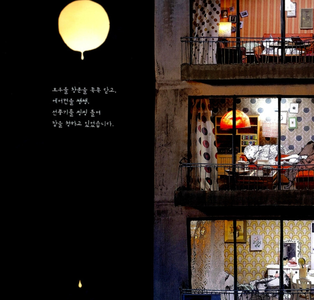 백희나 그림책의 특징은 작가가 직접 손으로 만들어낸 그림책의 모든 것을 살펴보는데 시간을 많이 할애하게 한다는 점이다. 전지적 시점으로 볼 수 있다는 대리만족의 발로 때문인지 특히나 아파트 한 동 전체가 전면으로 거실이 보이는 장면에선 눈을 뗄 수 없어 계속 머물게 된다. 똑같은 구조의 집들이지만 어떤 이들이 살고 있는지 인테리어는 어떤지 작가가 그린 그들의 숨은 이야기는 무엇일지 읽어내는 게 흥미롭다. 아마도 그 안에서 낯설지 않은 우리네 삶을 발견하기 때문이 아닐까.