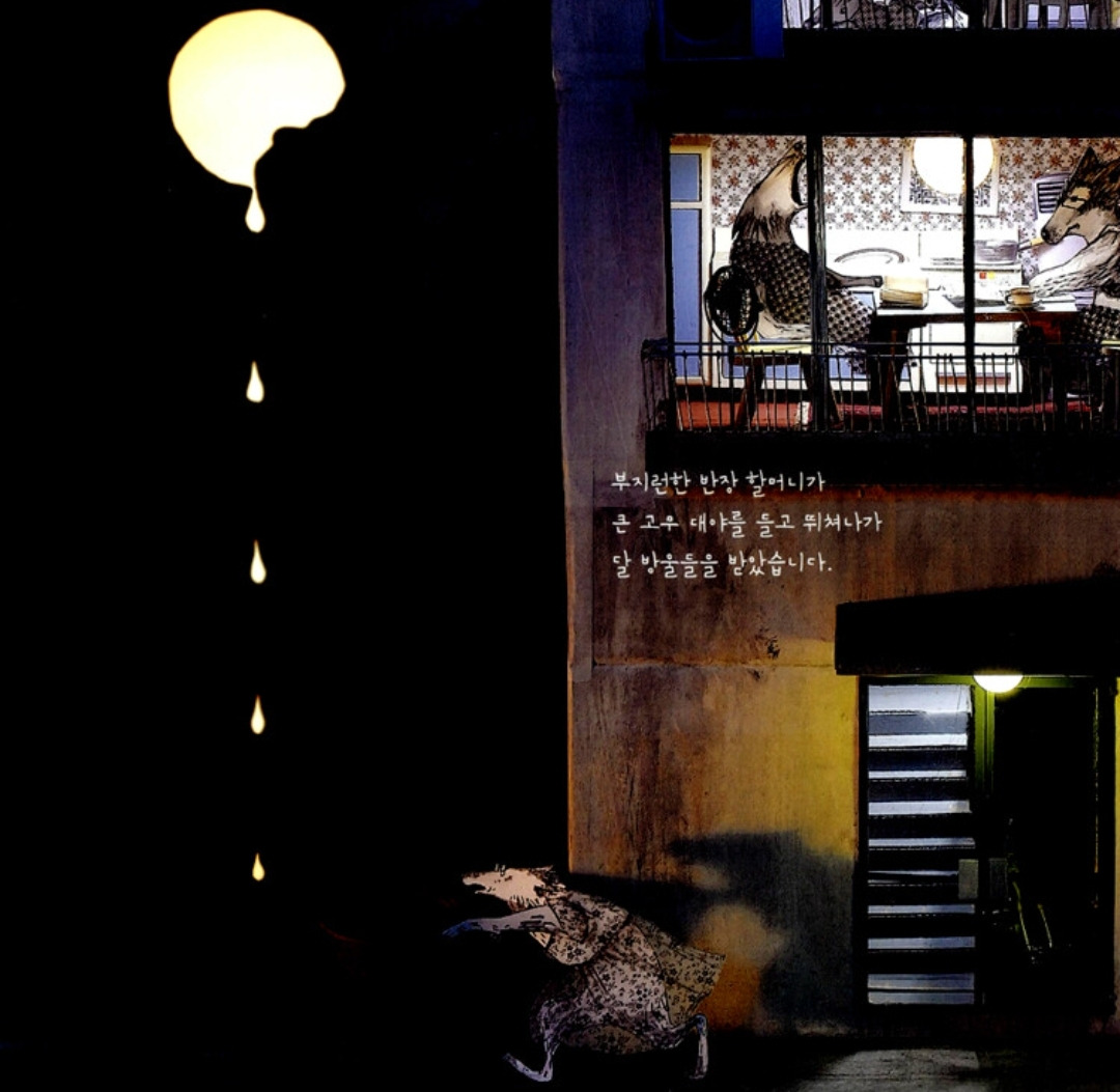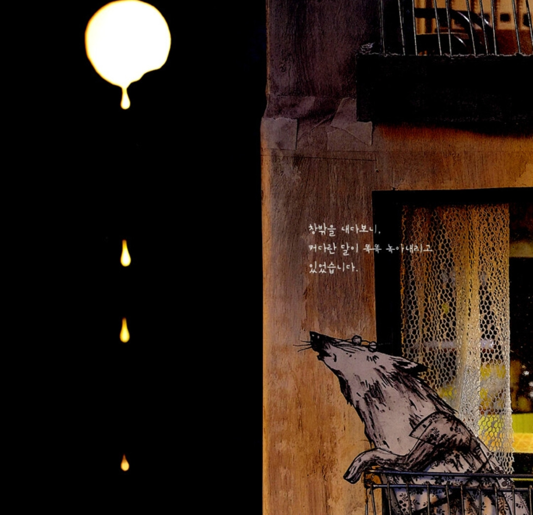 그나저나 이상한 9월이 계속되고 있다. 정말 우리들의 옥토끼 현실 달도 어느 날 갑자기 그림책처럼 녹아내리는 건 아닐까? 그렇담 달방울은 누가 받아내지? 혹 우리 집 이웃 그 요리 잘하는 어떤 분이 반장 할머니처럼 민첩하게 그러실 수 있을까? 그럼 난 노란빛이 새어 나오는 그 집을 찾으러 나서야겠다. 그리고 옥토끼처럼 예의 바르게 똑똑똑 문을 두드리고 이렇게 인사해야지. 바로 오늘의 요리는 아주아주 시원하고 달콤한 달샤베트군요, 라고.