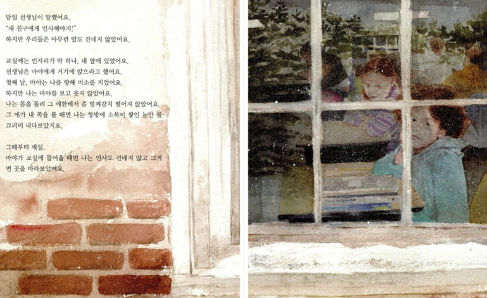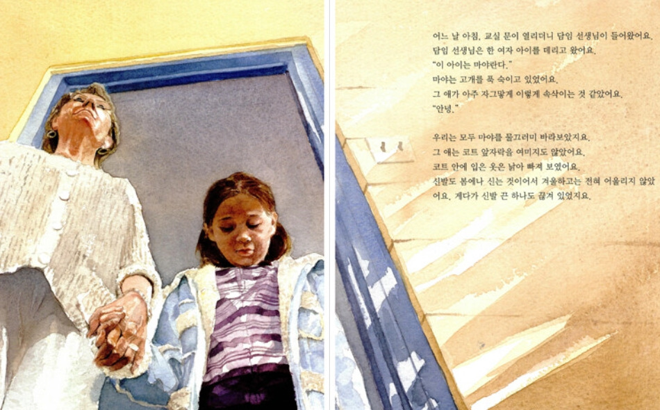 첫째 날, 마야는 나를 향해 미소를 지었어요. 하지만 나는 마야를 보고 웃지 않았어요.