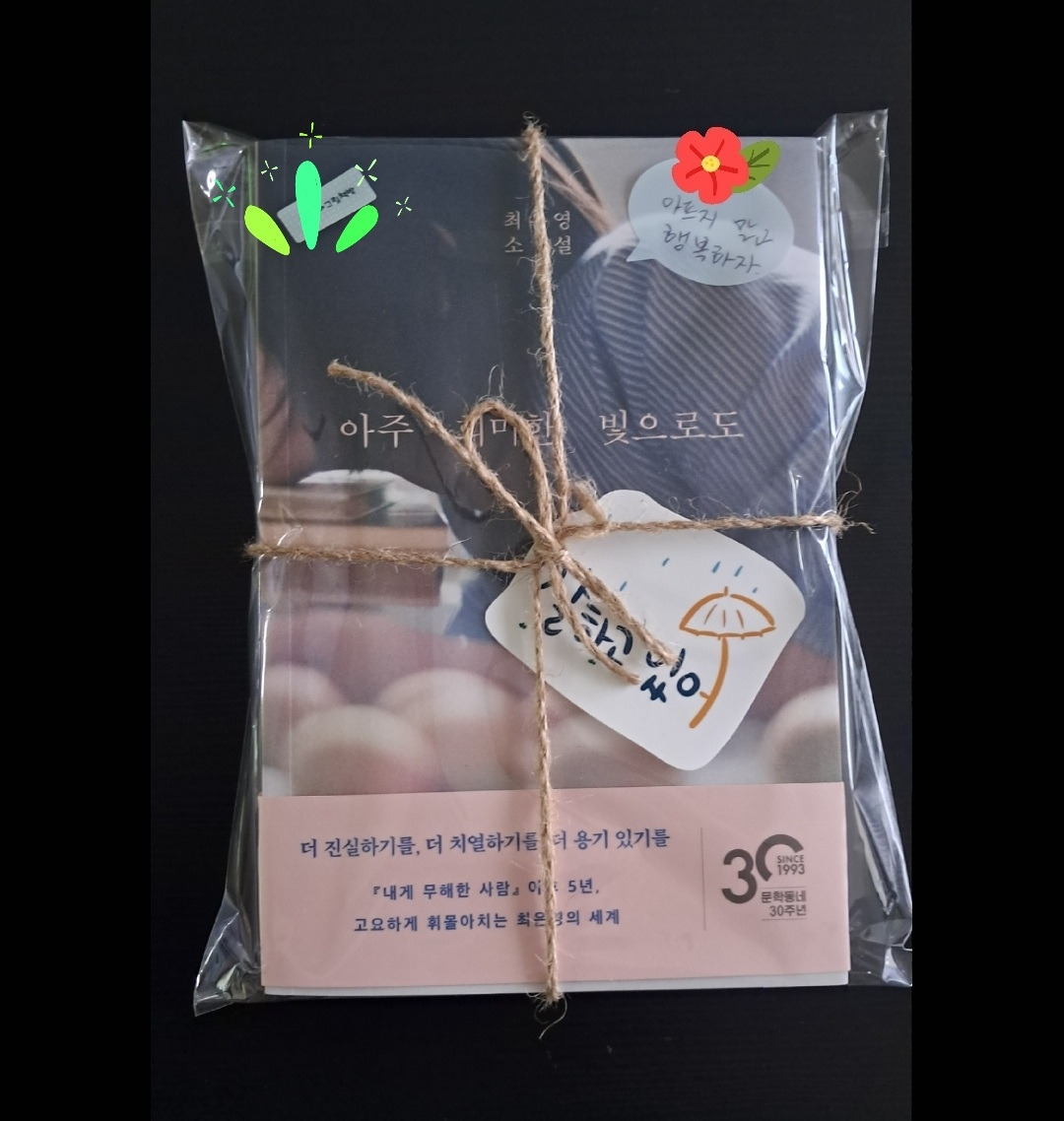 그냥 그랬어. 만나자고 먼저 말한 네게 주고 싶어서. 너의 이름을 부르고 글을 쓰고 선물 받은 스티커를 붙여보고 리본도 묶어봤어. 얼마큼 읽었어? 난 반 조금 넘게 읽었어. 다시 만나면 서로 그 얘기를 해보자.