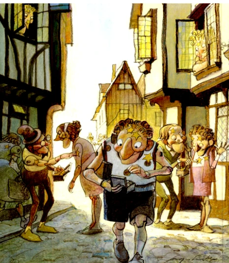 금빛 별표가 든 상자와 잿빛 점표가 든 상자를 들고 마을 구석구석을 돌아다니며 만나는 이들마다 서로 별표나 점표를 붙이며 하루를 보냈지. (p.9)