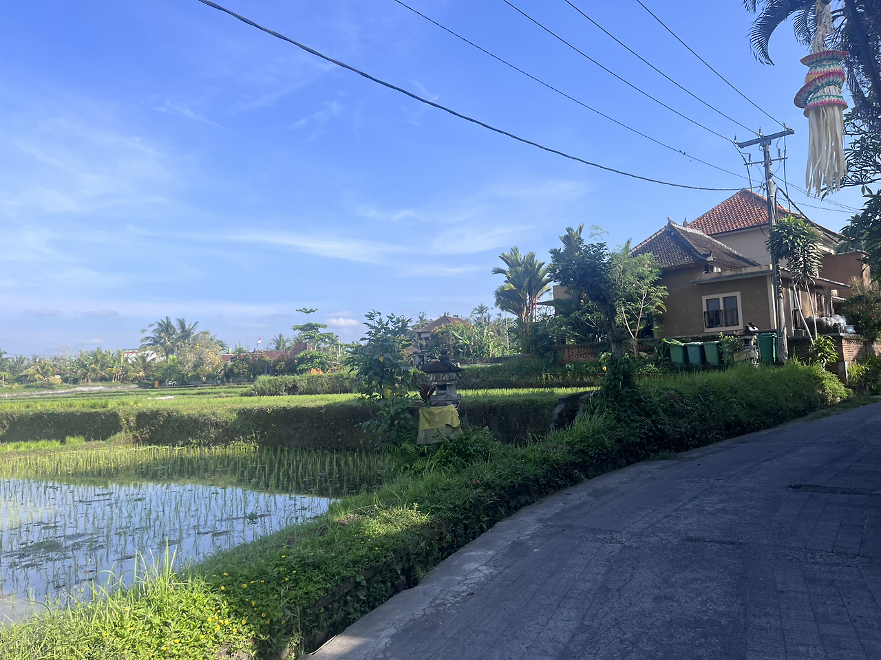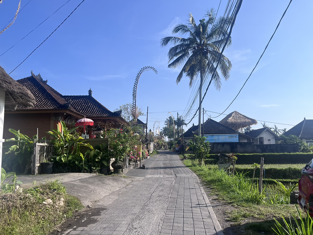 냅따 뛰어버렸다. 이쯤이면 뛸 수 있겠다 싶었다. 우붓에서도 한번은 뛰고 싶다는 욕심도 컸다. 그렇게 십분 정도 뛰고 나니 트래킹 로드가 끝났고, 거기에서 마주한 마을이 너무 이뻤다. 햇살 아래 논밭뷰가 평화로워보였고, 아기자기한 집들이 귀여웠다. 역시 우연한 기쁨이 가장 만족도가 높다는 단순한 진리.