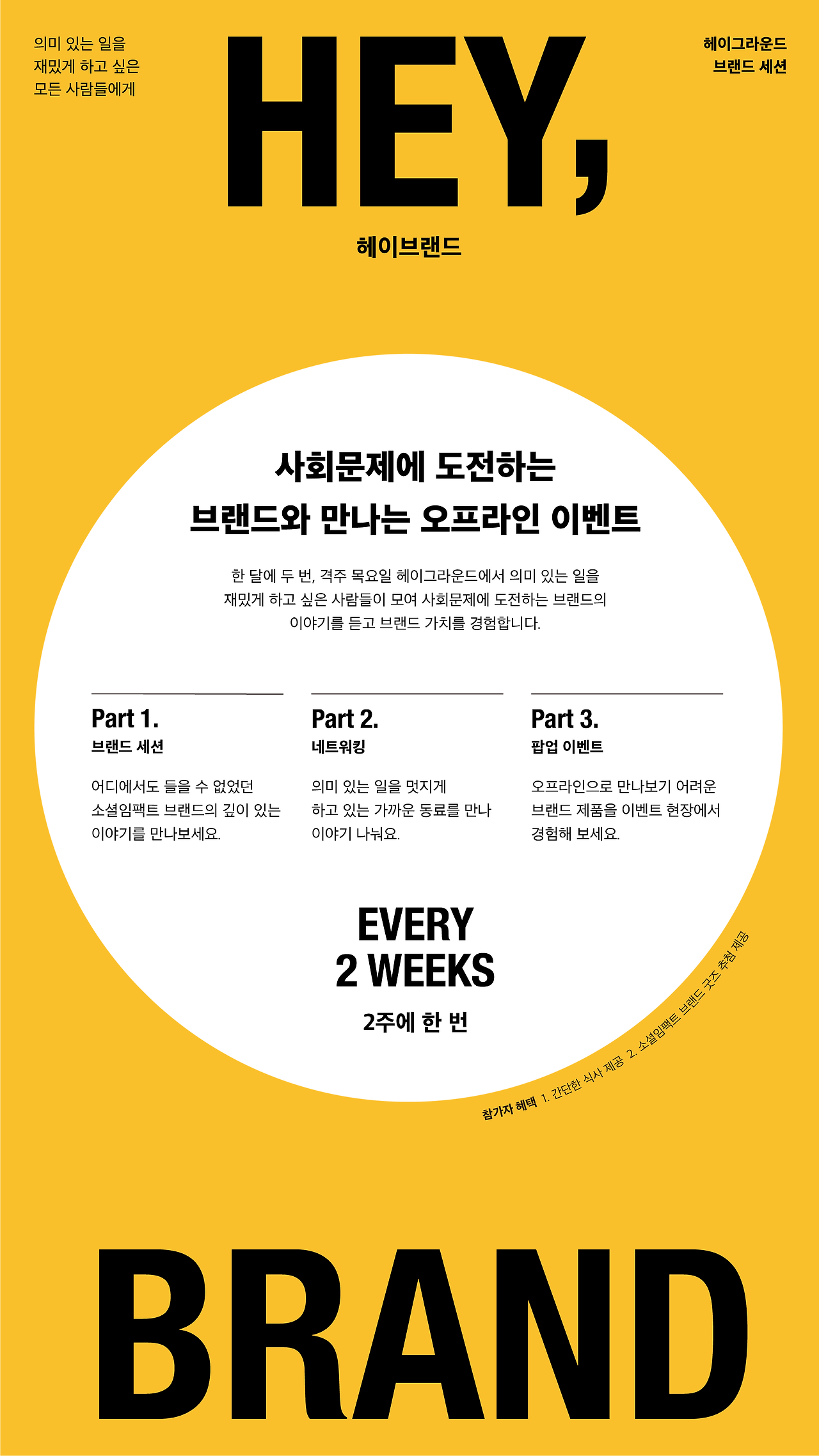 헤이브랜드는 격주 목요일에 한 번 특정 브랜드의 철학과 신념, 온라인에서 접하기 어려운 생생한 이야기를 듣는 브랜드 세션입니다. 헤이브랜드가 특별한 이유는 ‘브랜드’에 있습니다. 사회문제에 도전하는, 의미 있는 일을 멋지게 하는 브랜드와 함께하기 때문이죠. 회사 밖 동료를 만나는 네트워킹, 브랜드 가치를 경험할 수 있는 팝업 이벤트, 브랜드 굿즈 당첨의 행운은 덤.