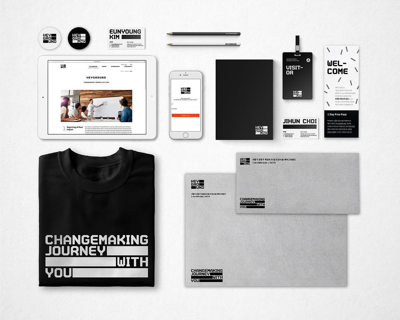 헤이그라운드 로고타입에 적용된 블록 형상은 각각의 구성원을 상징하며 ‘함께 성장하다’, ‘함께 가치를 쌓아가다’, ‘체인지메이커로 도약하다’ 등의 의미에 따라 유동적으로 변화한다. 또한 헤이그라운드만의 고유 서체를 개발하여 독특한 정체성을 표출하였으며, 이를 바탕으로 비주얼 아이덴티티 시스템을 개발하여 커뮤니티 활동과 웹사이트, 인쇄물, 사이니지 등의 다양한 매체에서 일관성 있는 브랜드 경험을 전달하고 있다.