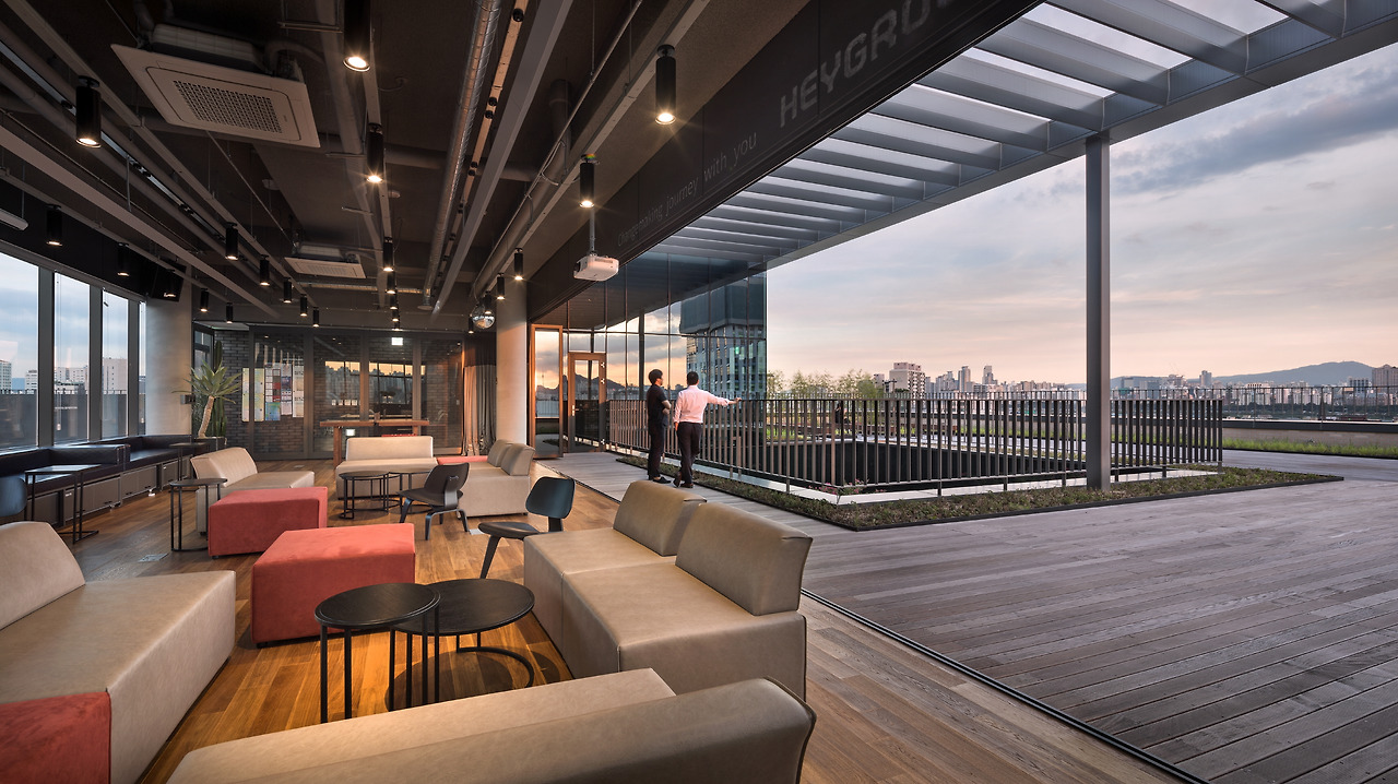헤이그라운드는 엘리베이터, 계단실 그리고 키친을 서로 인접하게 배치하고, 내부 계단으로 연결되는 복층형 라운지를 2개층 단위로 배치하여 구성원들이 일상적으로 쉽게 교류할 수 있다. 그리고 7층에 나란히 배치된 인터렉션라운지와 그린라운지는 외부의 자연을 내부로 끌어들여 쾌적함을 누릴 수 있도록 하였다. 이 공간은 디럭스 한 소파와 라운지체어로 구성되어 있어 내 집 같은 편안함을 느낄 수 있는 장점이 있다. 또한 최상층의 스카이라운지와 테라스는 은신처 같은 공간으로서 업무로 인한 긴장을 풀어준다. 다양한 행사에 적합한 키친, 가구 그리고 조명이 있어 가벼운 회의, 세미나, 요가 등의 복합적인 활용이 가능하다.