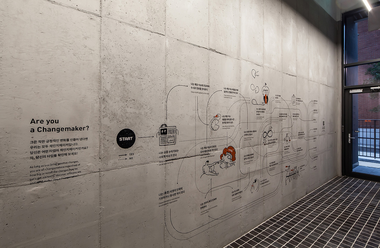 사이니지 디자인은 체인지메이커들의 오피스 이용에 기능적으로 도움을 줄 뿐만 아니라 그들의 커뮤니티를 형성하는 것에도 목적을 두었다. 공간에서 독립적으로 두드러지지 않고 이음매 없이 합체되는 디자인을 추구하고 일러스트 및 슈퍼그래픽을 활용하여 그때그때 기분을 전환시킬 수 있기를 의도하였다. 또한 커뮤니티의 활성화를 위해 구성원들이 자유롭게 이용할 수 있는 게시판을 통로 곳곳에 설치하여 수시로 자연스러운 소통이 이루어지도록 하였다. 마지막으로 2~5층의 독립 오피스의 경우, 슬라이딩 타입으로 간단하게 탈부착 가능한 입주사 사이니지 시스템을 제공하여 각 회사별로 원하는 방식으로 아이덴티티를 드러낼 수 있도록 지원하였다.