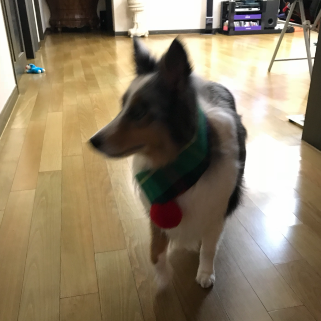 크리스마스용 목도리였다. 정리하는 이모의 가방을 킁킁거리다가 데일이는 코로 그 목도리를 쿸- 찍었다고 한다. 그건 이 목도리를 낀 모습을 사람들이 좋아하기 때문에 끼고 자랑하고 싶다는 뜻이라고 했다. 고개를 아래로 내려서 끼워달래서 끼워줬더니, 패션쇼를 하고 있는 것이 아닌가!