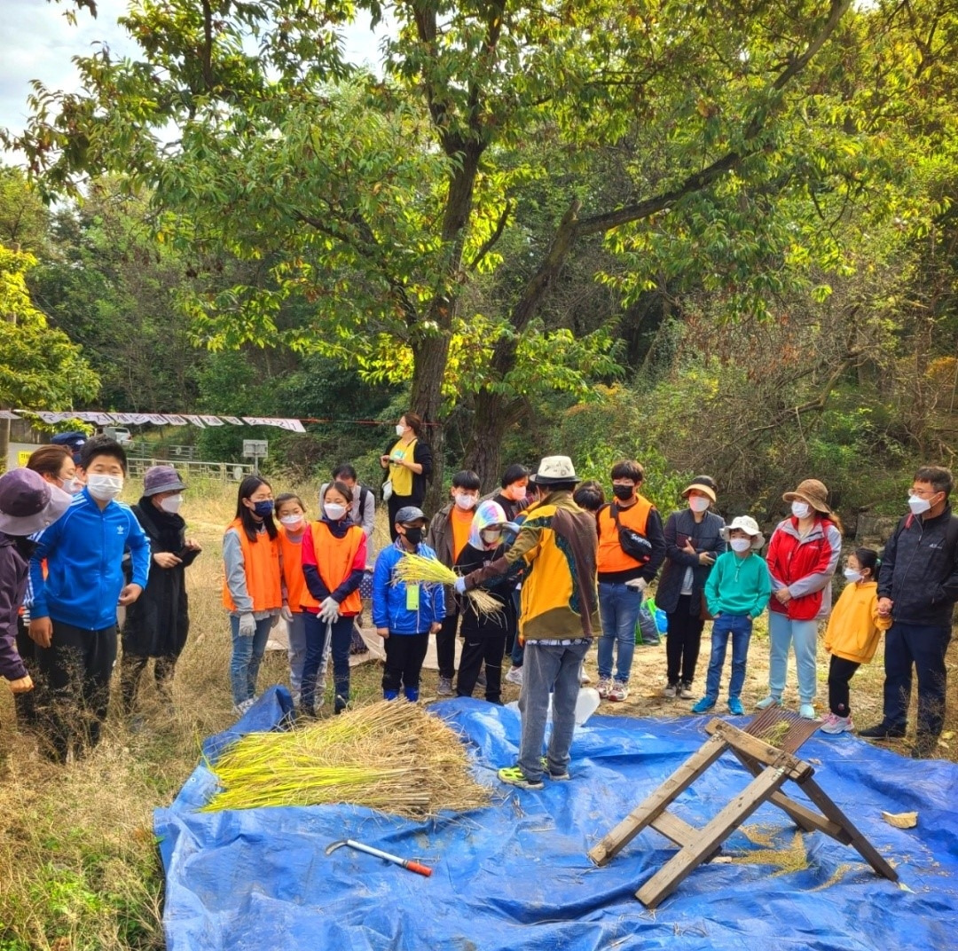 쌀 한 톨을 얻기 위해서 농부의 88번의 손길이 간다고 한다. 그중에 오늘은 벼를 베고, 홀태로 벼 이삭을 훑어내고, 낟알을 도정하고, 키질하는 마무리 단계를 경험할 수 있다. 한 주먹의 쌀알을 아이의 손에 들려주기까지 옛날 선조의 방식을 따라보는 것이다. 먼저 아이들에게 낫을 쥐여주었다. 무수골에 터를 잡고 사는 어르신들은 아이들이 다치지 않도록 낫의 날을 잡는 방법부터 낫질하는 방향까지 꼼꼼하게 알려준다. 아이들은 한 줄로 서서 호기롭게 손으로 곡식을 한 줌 잡고 낫질을 시도한다. 생각보다 싹싹 잘리지 않아서 당황하는 눈치다. 벼의 뿌리가 땅에 단단히 박혀 지탱했던 무게에 아이들은 굽혔던 허리를 폈다 다시 굽힌다. 곧이어 콤바인 기계가 논밭에 들어서자 듬직한 말처럼 푸드덕거리며 주행한다. 질서 정연하게 곡식들이 차례차례 눕자 겨가 분리된다. 벌거숭이가 되는 밭에서 길을 잃은 청개구리가 뛰어다닌다.
