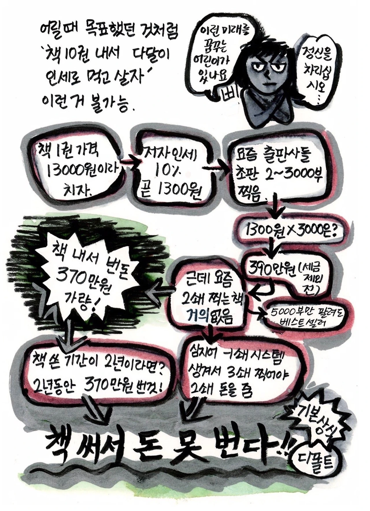 많은 직장동료들이 책을 좋아해 주고, 축하의 말을 건넸다. 그리고 "돈은 좀 벌었어? 이제 전업 작가 되는 거야?"라는 질문을 제일 많이 받았는데... 요즘 구독하고 있는 이다님의 '매일 마감'(추천합니다! 재미있어요!)에 실렸던 아래 그림이 가장 정확한 답이 될 것 같다.