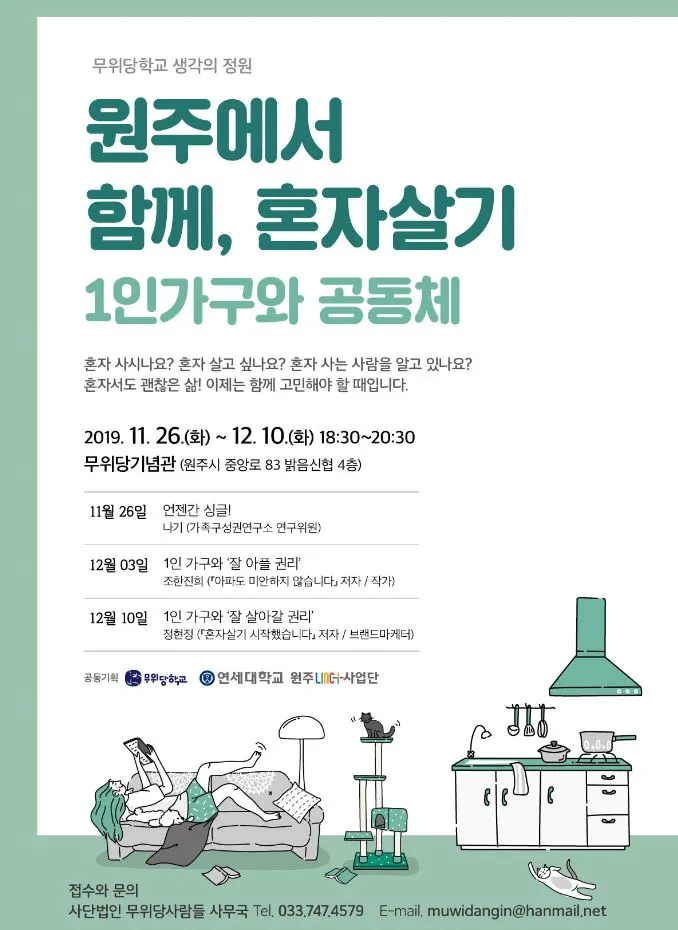 원주에 다녀왔다. <원주에서 함께, 혼자살기>는 원주 무위당학교에서 기획한 1인 가구와 공동체에 대한 강연 시리즈다. 나는 <1인 가구와 잘 살아갈 권리>라는 주제로 ‘혼자 살기 시작했습니다’ 북토크를 진행했다. 나기님, 조한진희님 뒤를 이은 세 번째 시간이자 마지막 시간이었다.