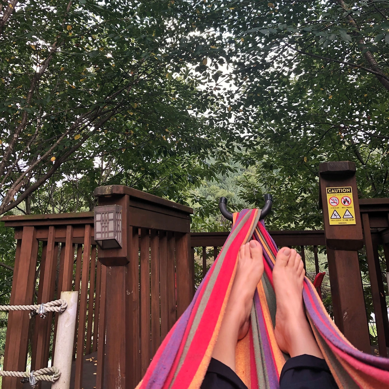 캠핑장은 강원도 영월의 산속 마을에 있었다. 굽이 굽이 시골길을 따라가다 보면 거짓말처럼 아름다운 풍광의 캠핑장이 드러난다. 비장한 마음으로 요란스럽게 출발했지만, 사실 캠핑장에서 빌린 곳은 이미 다 텐트가 쳐져 있는 ‘다차 사이트’여서 우리가 할 일은 고기 구워 먹고 자는 일 밖에 없었다. 도착하자마자 캠핑 전문가가 처음 가는 사람은 무조건 좋아할 거라고 조언해준 해먹을 빌렸다. 오랜만에 나간 교외에서, 공기 좋고 햇살 좋은 숲 속에서, 나무 사이 해먹에 누워 있는 게 싫을 수가 없었다. 누워서 졸았다가, 책을 읽었다가 하며 자연스럽게 캠핑장에 녹아들었다.