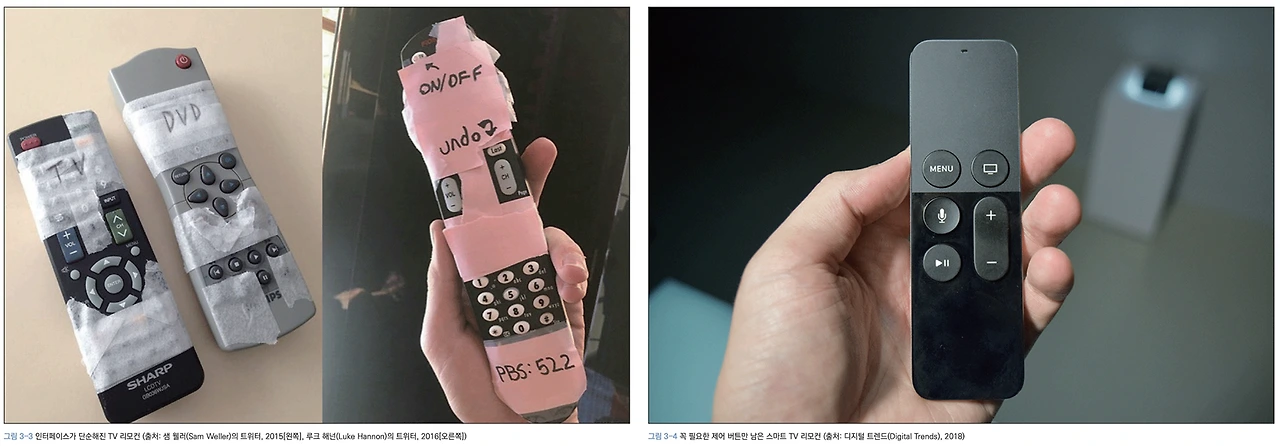 이러한 문제를 잘 해결한 예는 애플 tv의 리모컨이다. 꼭 필요한 버튼들만 남기고 나머지는 화면에서 software로 선택을 하도록 문제를 해결하였다.