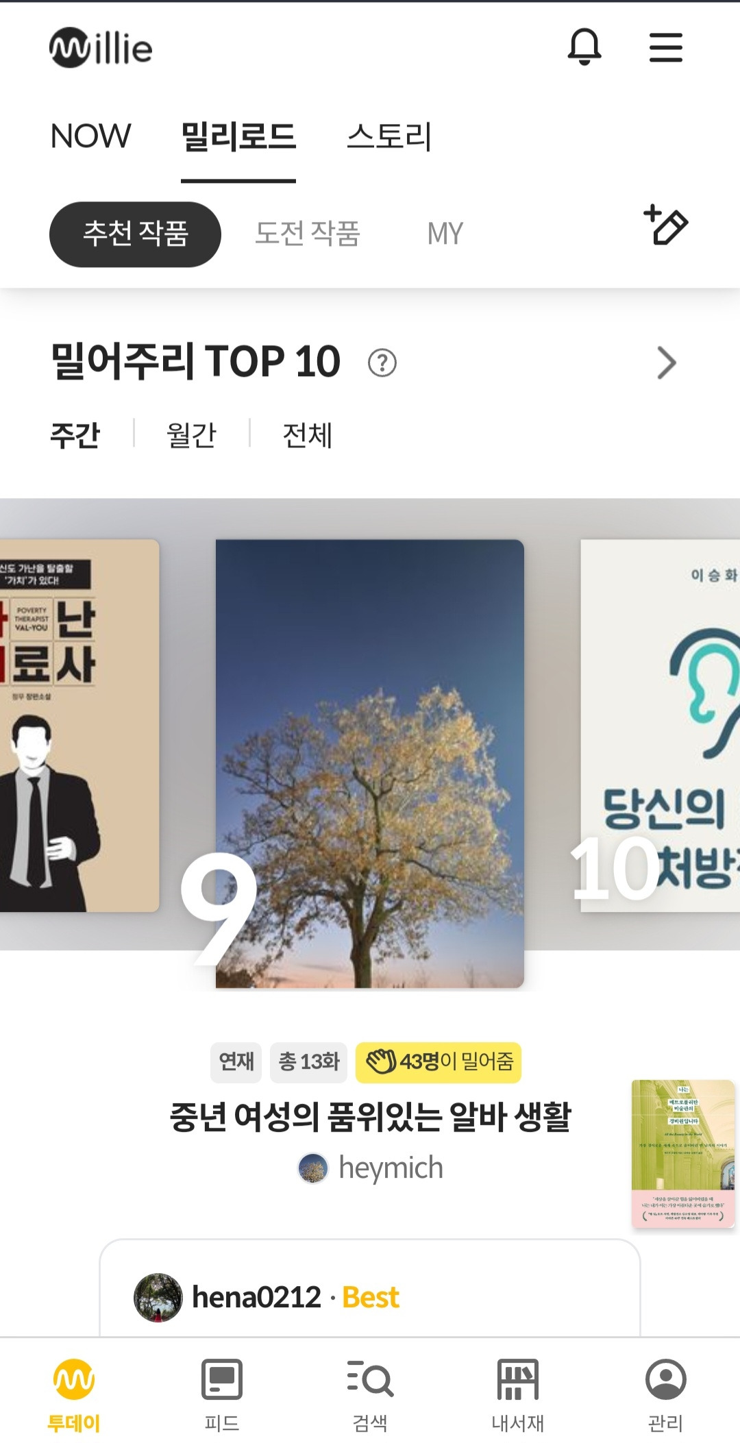 밀리의 서재, 밀리 로드에 도전하세요. 매달 창작 지원금 이벤트를 진행하고 있어요. 지금은 제가 구독하는 SE HO 작가님과 헤이란 작가님이 추천작으로 올라와 있어요.