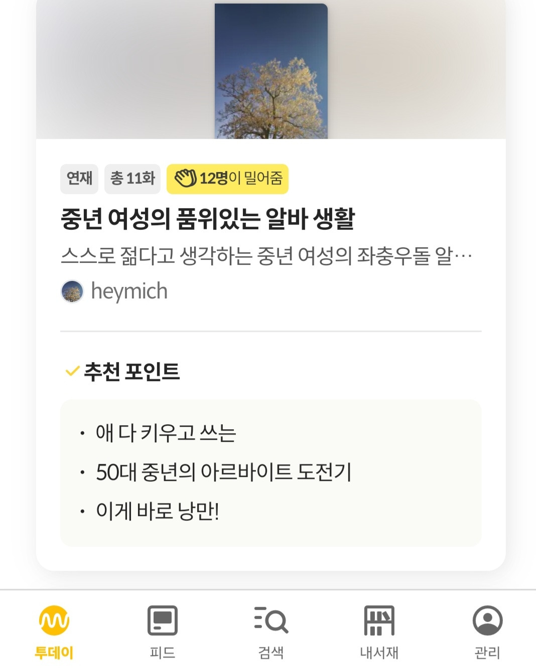 그런데 천 개가 되지 않더라고 밀리 로드의 픽으로 출간할 수도 있습니다. 저는 브런치 영글음 작가님의 글을 읽고 지난 2월 1일부터 ‘중년 여성의 품위 있는 알바 생활’을 올리기 시작했습니다.