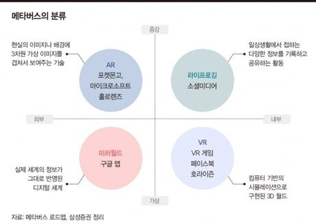 메타버스는 가상을 의미하는 'meta'와 세계를 의미하는 'universe'의 합성어로 3차원 가상세계를 의미한다. 크게 가상현실, 증강현실, 라이프로깅, 거울세계로 구분할 수 있다. 현재는 라이프로깅과 관련된 메타버스 콘텐츠들이 크게 성장하고 있다.