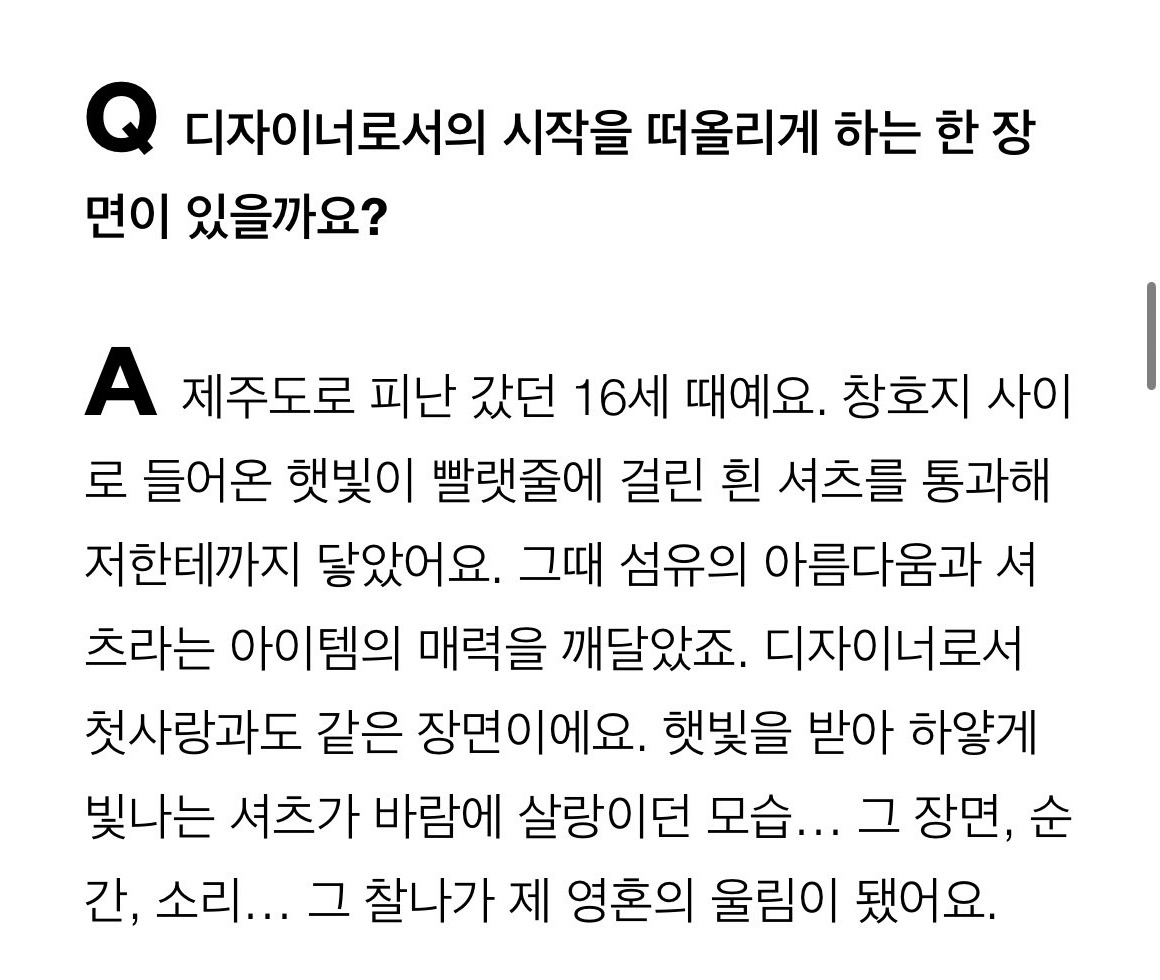 우연히 90세 디자이너의 인터뷰를 읽었다. 코스모폴리탄에 실린 34년생 진태옥 디자이너 이야기다. 한국 기성복 시대를 연 장본인인 그는, 소녀 시절에 흰 셔츠를 본 찰나의 순간이 자신을 디자인으로 이끌었다고 고백한다.