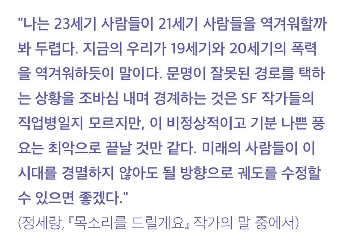다시 말하지만 나는 인간이 정말 싫다. 마치 세상은 악인의 형통을 위해 존재하는 것 같다. 선한 사람들은 항상 지는 것처럼 보이고, 악인들은 수치를 모르고 점점 더 큰 목소리를 내는 것 같다. 이럴 땐 어쩌라고 정신이 필요하다. 세상이 나쁜데 어쩌라고. 그래도 나는 오늘 옳다고 생각하는 일을 계속해야지. 이토록 미약한 내가 매일 한계와 무기력을 마주치더라도, 실패와 후퇴를 거듭하더라도, 계속 올바른 선택을 하면서 살아야지.