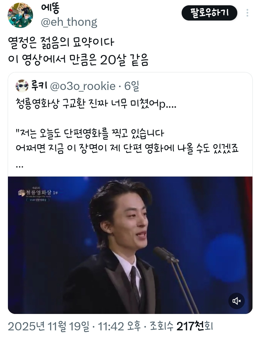 그러다가 최근 청룡 영화제에서 화제가 된 구교환의 수상소감을 보게 됐다. 그는 수상소감에서 '연기를 했다'