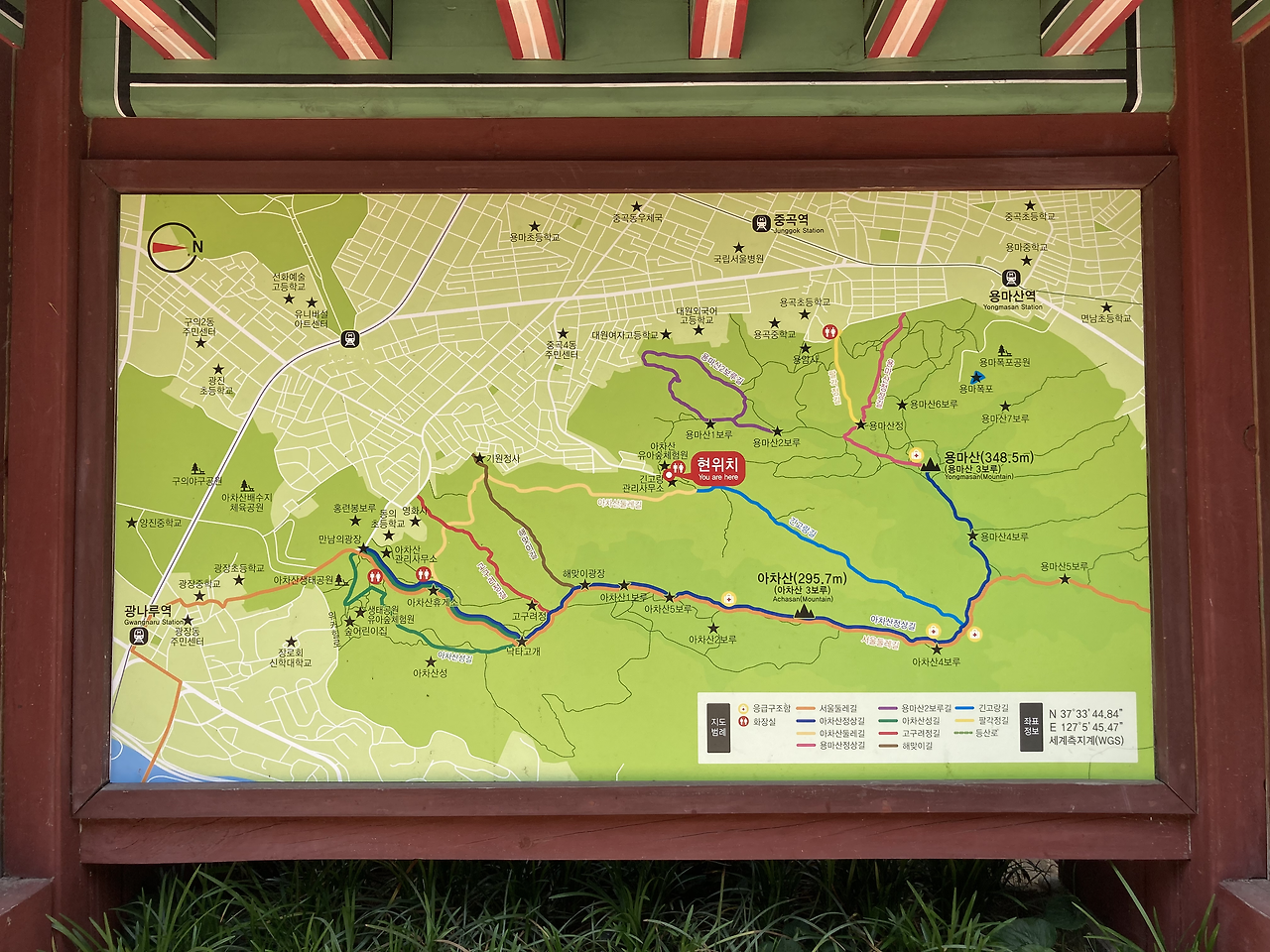 산 중턱에서 길을 잃었다(기 보다는) 이 길이 정상으로 향하는 길인지 확신이 없었다. 사람이 밟고 다닌 길 같았지만, 바위는 너무 가팔랐고 흙은 미끄러웠다. 지도는 용마산 정상과 아차산 정상을 향한 가운데 즈음 우리가 위치함을 알려주었다. 아차산 정상을 향한 길이 너무 가파른 계단 길이라 용마산으로 방향을 틀었다가 아차산 둘레길만 걷고 내려와 다시 용마산 정상을 향한 참이었다. 긴고랑길 계곡을 걷다가 우측으로 가면 아차산 능선길, 좌측으로 가면 용마산 정상 1.1km.